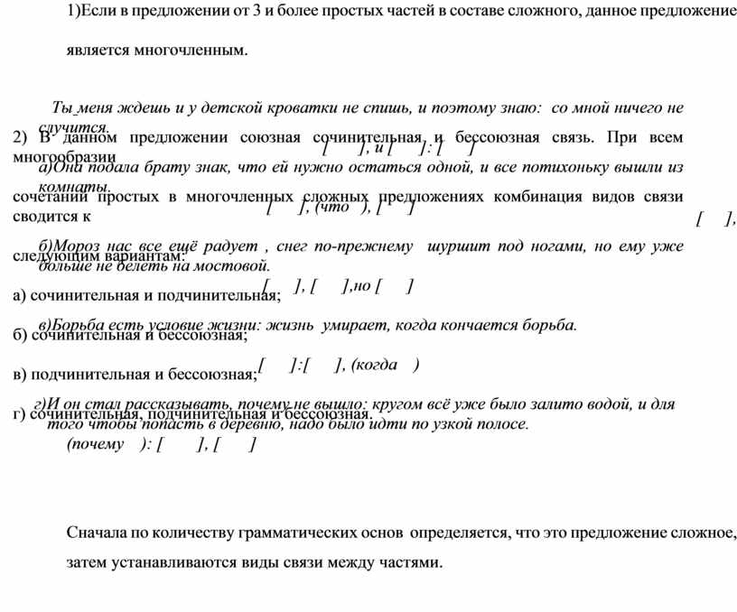 сочетаний простых в многочленных сложных предложениях комбинация видов связи сводится к