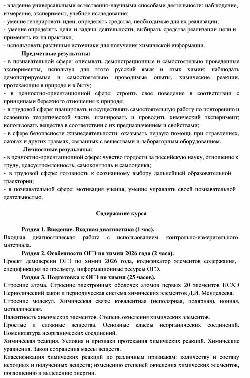 Программа курса предназначена для подготовки учащихся 9 класса, выбравших учебный предмет «Химия» для прохождения государственной итоговой аттестации в форме основного государственного экзамена (далее – ОГЭ) и планирующих в дальнейшем изучение химии на профильном уровне.