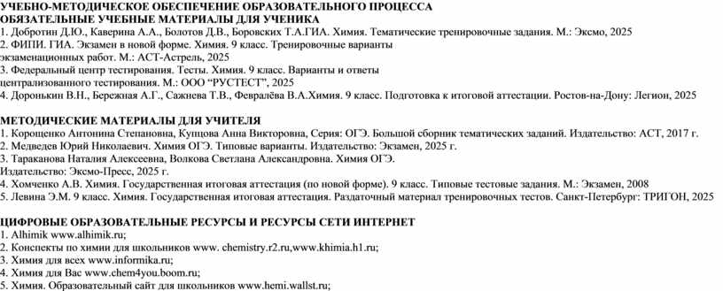 1. Добротин Д.Ю., Каверина А.А., Болотов Д.В., Боровских Т.А.ГИА. Химия. Тематические тренировочные задания. М.: Эксмо, 2025