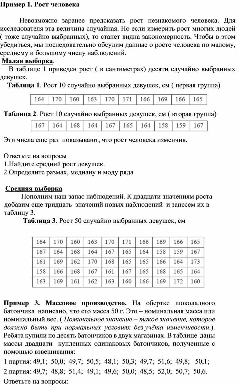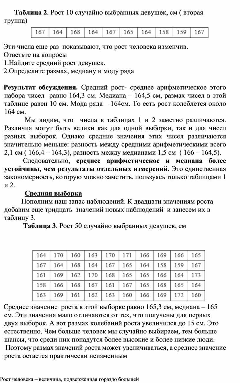 Мы видим, что числа в таблицах 1 и 2 заметно различаются. Различия могут быть велики как для одной выборки, так и для чисел разных выборок. Однако средние значения этих чисел различаются значительно меньше: разность между средними арифметическими всего 2,1 см ( 166,4 – 164,3), разность между медианами 1,5 см ( 166 – 164,5).