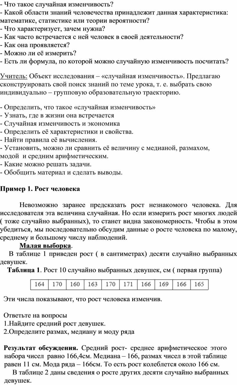 -познакомить учащихся с новой статистической характеристикой, как случайная изменчивость,