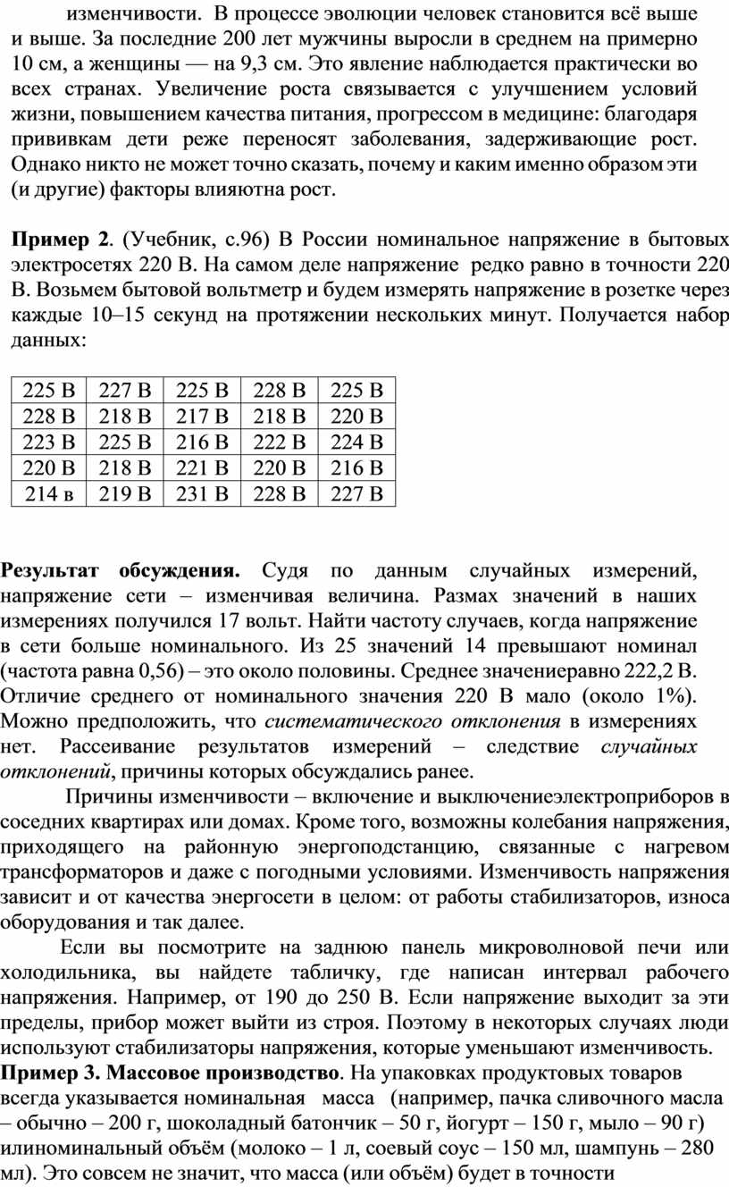 Пример 2. (Учебник, с.96) В России номинальное напряжение в бытовых электросетях 220 В. На самом деле напряжение редко равно в точности 220 В. Возьмем бытовой вольтметр и будем измерять напряжение в розетке через каждые 10–15 секунд на протяжении нескольких минут. Получается набор данных: