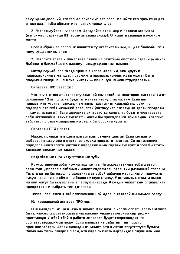 Мы намечаем для себя творческое фокусирование и хотим найти относящиеся к нему новые идеи. Мы выбираем слово, не имеющее ни малейшего отношения к ситуации, и соединяем его с фокусом.