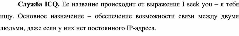 Служба ICQ. Ее название происходит от выражения I seek you – я тебя ищу. Основное назначение – обеспечение возможности связи между двумя людьми, даже если у них нет постоянного IP-адреса.