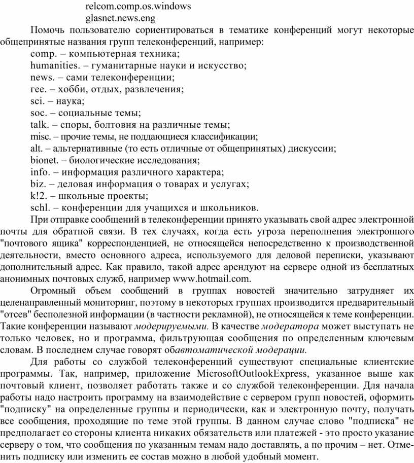 У каждой телеконференции есть свой собственный адрес в сети, организованный так же, как и обычный почтовый адрес пользователя, например: news.kids.ms. В этом адресе отсутствует лишь левая часть – персональное имя почтового ящика пользователя. Каждое слово в адресе телеконференции служит для уточнения содержания вопросов, обсуждаемых в телеконференции. Самое первое слово означает принадлежность конференции к определенному разделу в общепринятой иерархии телеконференций, обычно совпадающей с названием сети, где они проводятся.