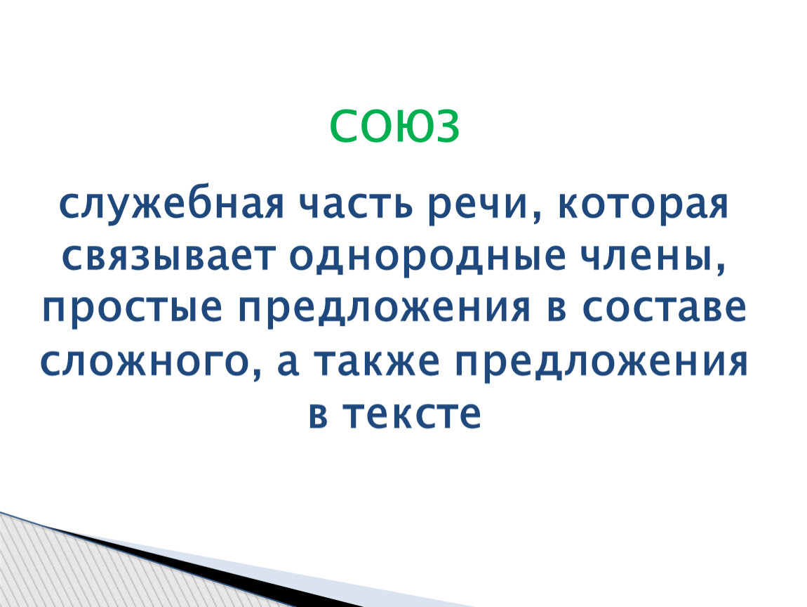 СОЮЗ служебная часть речи, котораясвязывает однородные члены,простые предложения в составе сложного, а также предложения в тексте
