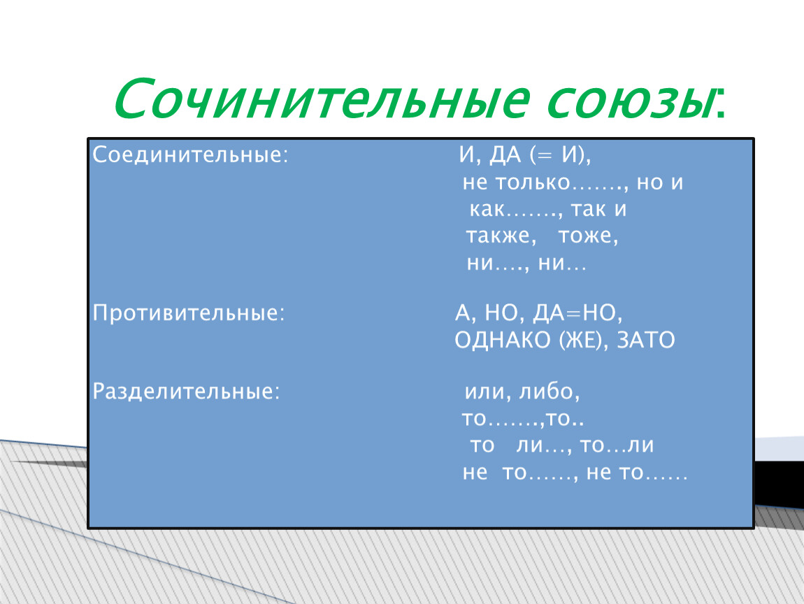 Соединительные: И, ДА (= И), не только……., но и как……., так и также, тоже, ни…., ни…Противительные: А, НО, ДА=НО, ОДНАКО (ЖЕ), ЗАТОРазделительные: или, либо, то…….,то.. то ли…, то…ли не то……, не то……