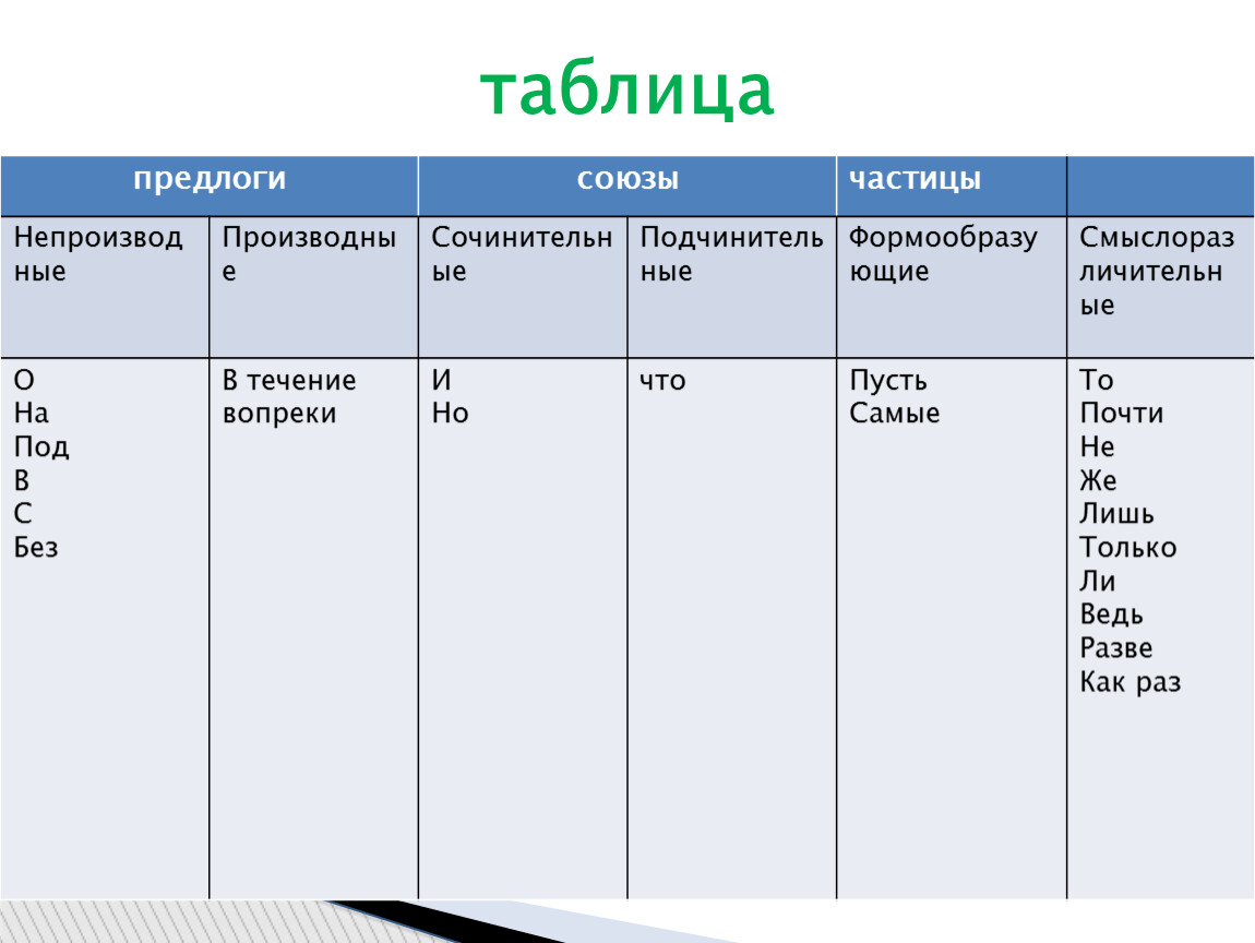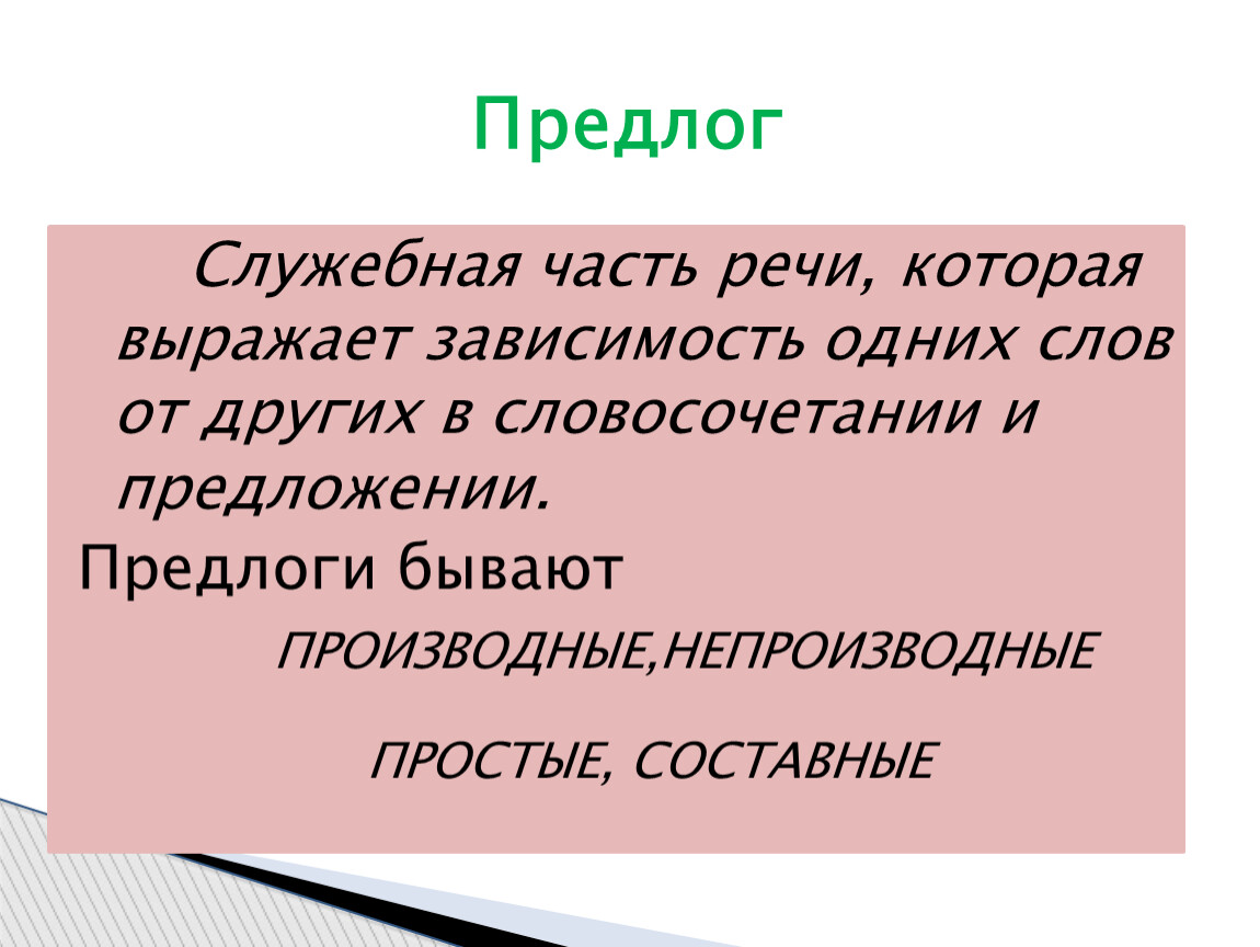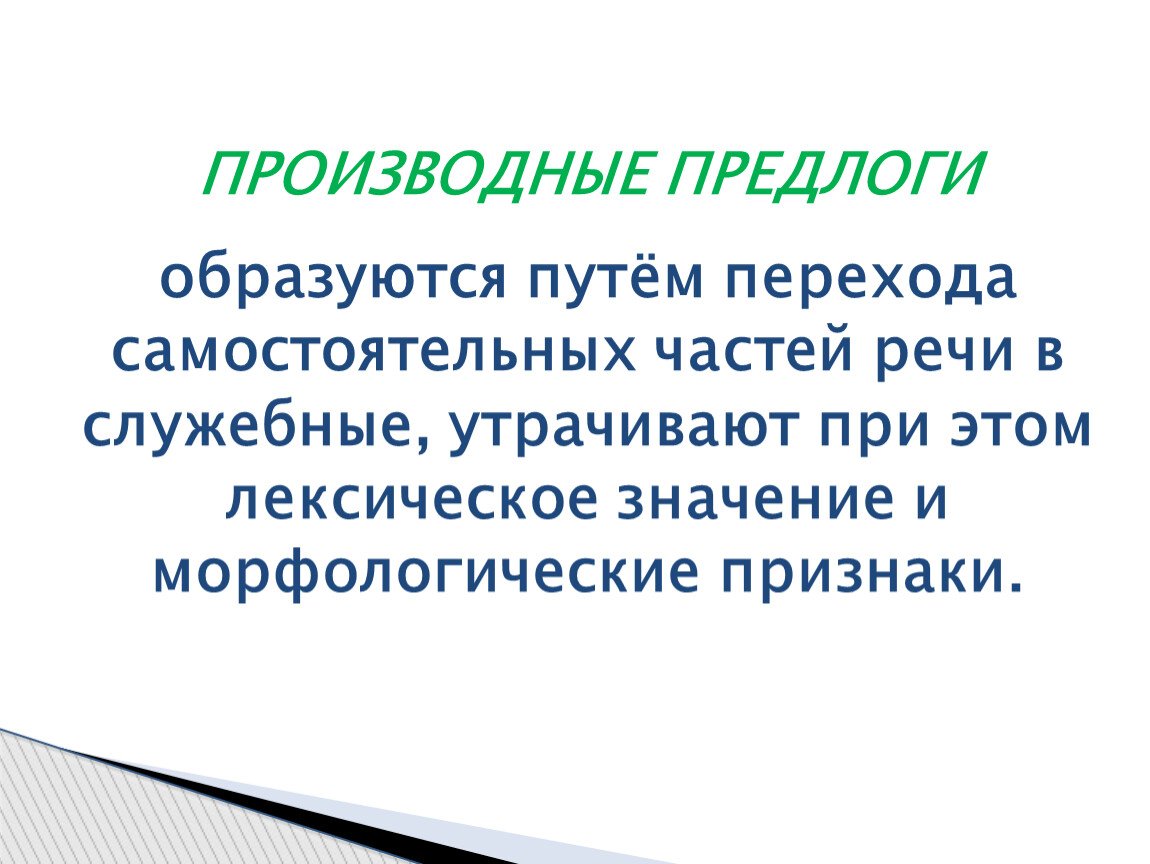 ПРОИЗВОДНЫЕ ПРЕДЛОГИ образуются путём перехода самостоятельных частей речи в служебные, утрачивают при этомлексическое значение иморфологические признаки.