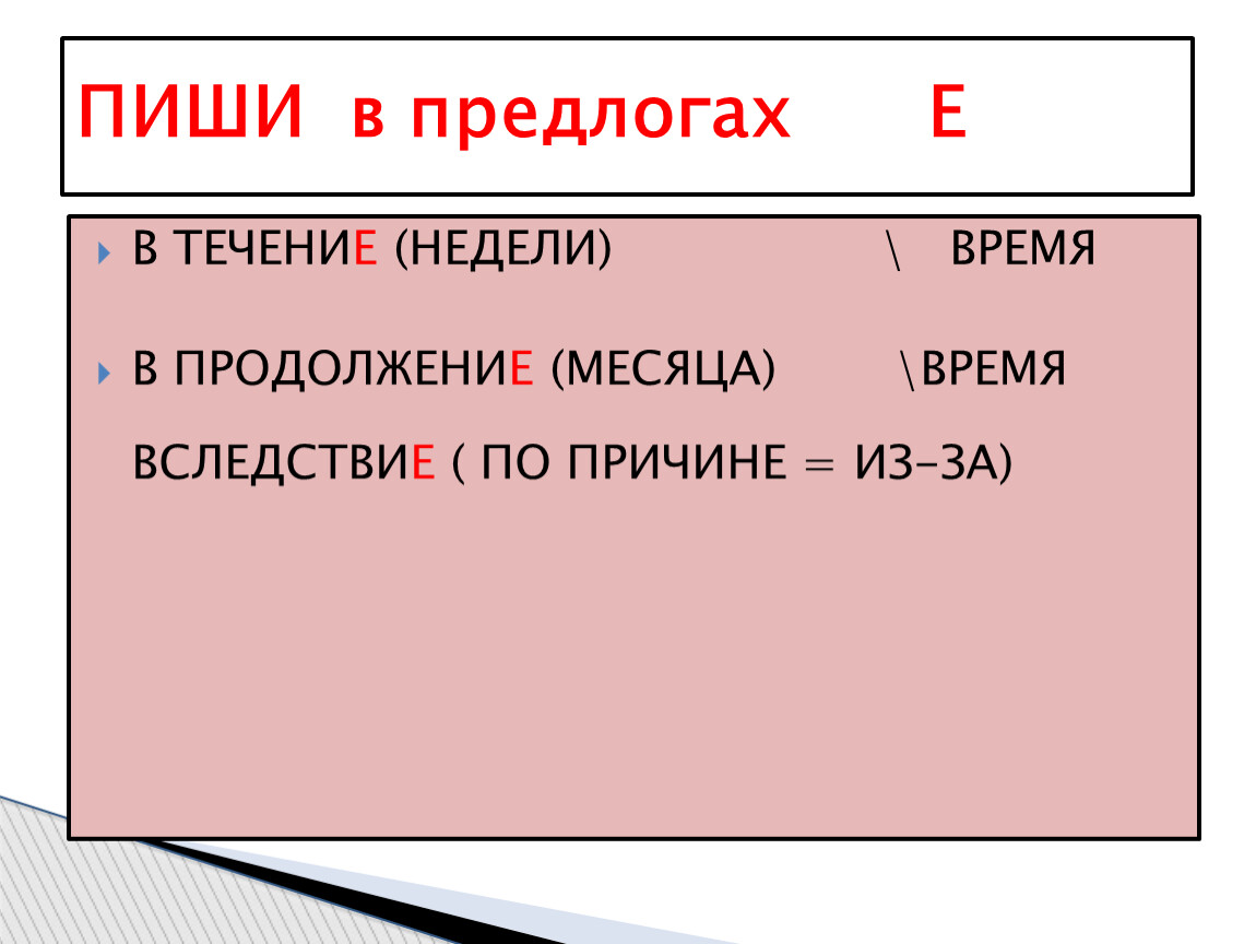 В ПРОДОЛЖЕНИЕ (МЕСЯЦА) \ВРЕМЯВСЛЕДСТВИЕ ( ПО ПРИЧИНЕ = ИЗ-ЗА)
