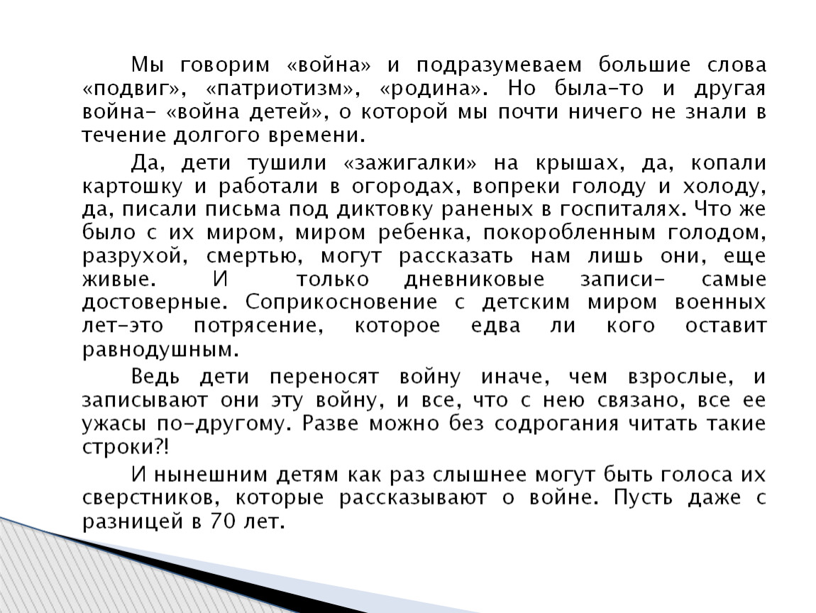Да, дети тушили «зажигалки» на крышах, да, копали картошку и работали в огородах, вопреки голоду и холоду, да, писали письма под диктовку раненых в госпиталях. Что же было с их миром, миром ребенка, покоробленным голодом, разрухой, смертью, могут рассказать нам лишь они, еще живые. И только дневниковые записи- самые достоверные. Соприкосновение с детским миром военных лет-это потрясение, которое едва ли кого оставит равнодушным.