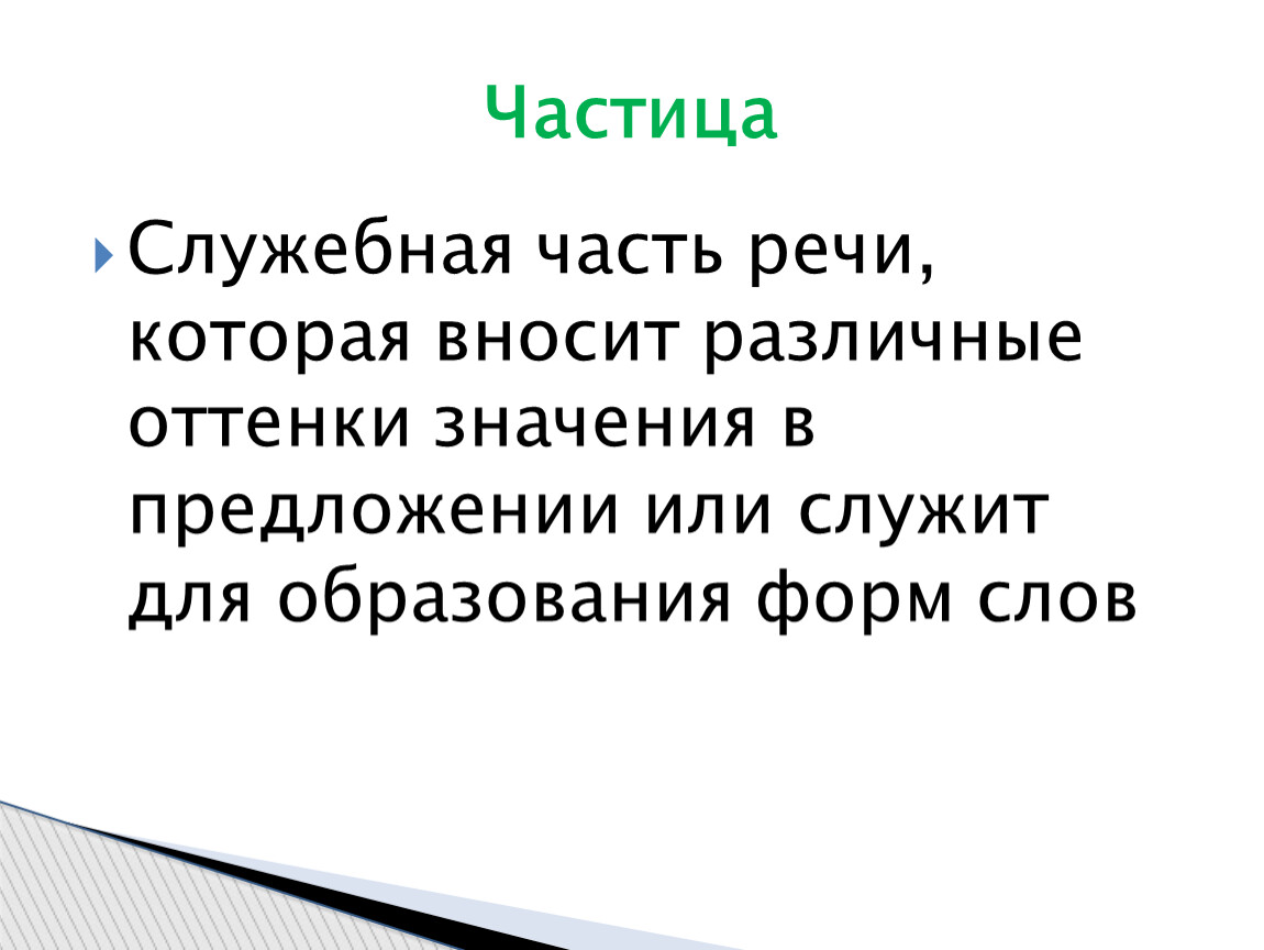 Служебная часть речи, которая вносит различные оттенки значения в предложении или служит для образования форм слов