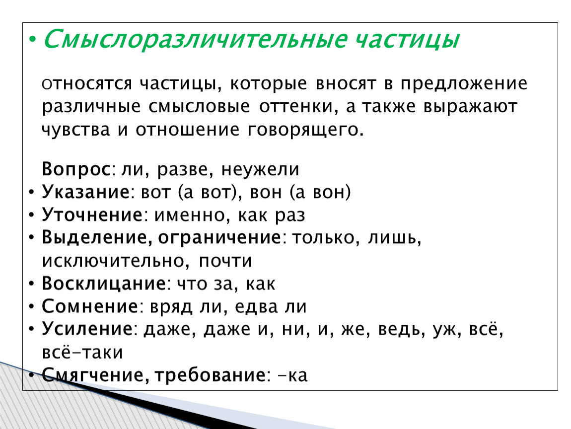 Смыслоразличительные частицыОтносятся частицы, которые вносят в предложение различные смысловые оттенки, а также выражают чувства и отношение говорящего.Вопрос: ли, разве, неужели