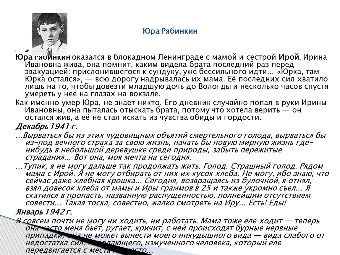 Юра Рябинкин оказался в блокадном Ленинграде с мамой и сестрой Ирой. Ирина Ивановна жива, она помнит, каким видела брата последний раз перед эвакуацией: прислонившегося к сундуку, уже бессильного идти... «Юрка, там Юрка остался», — всю дорогу надрывалась их мама. Её последних сил хватило лишь на то, чтобы довезти младшую дочь до Вологды и несколько часов спустя умереть у неё на глазах на вокзале.
