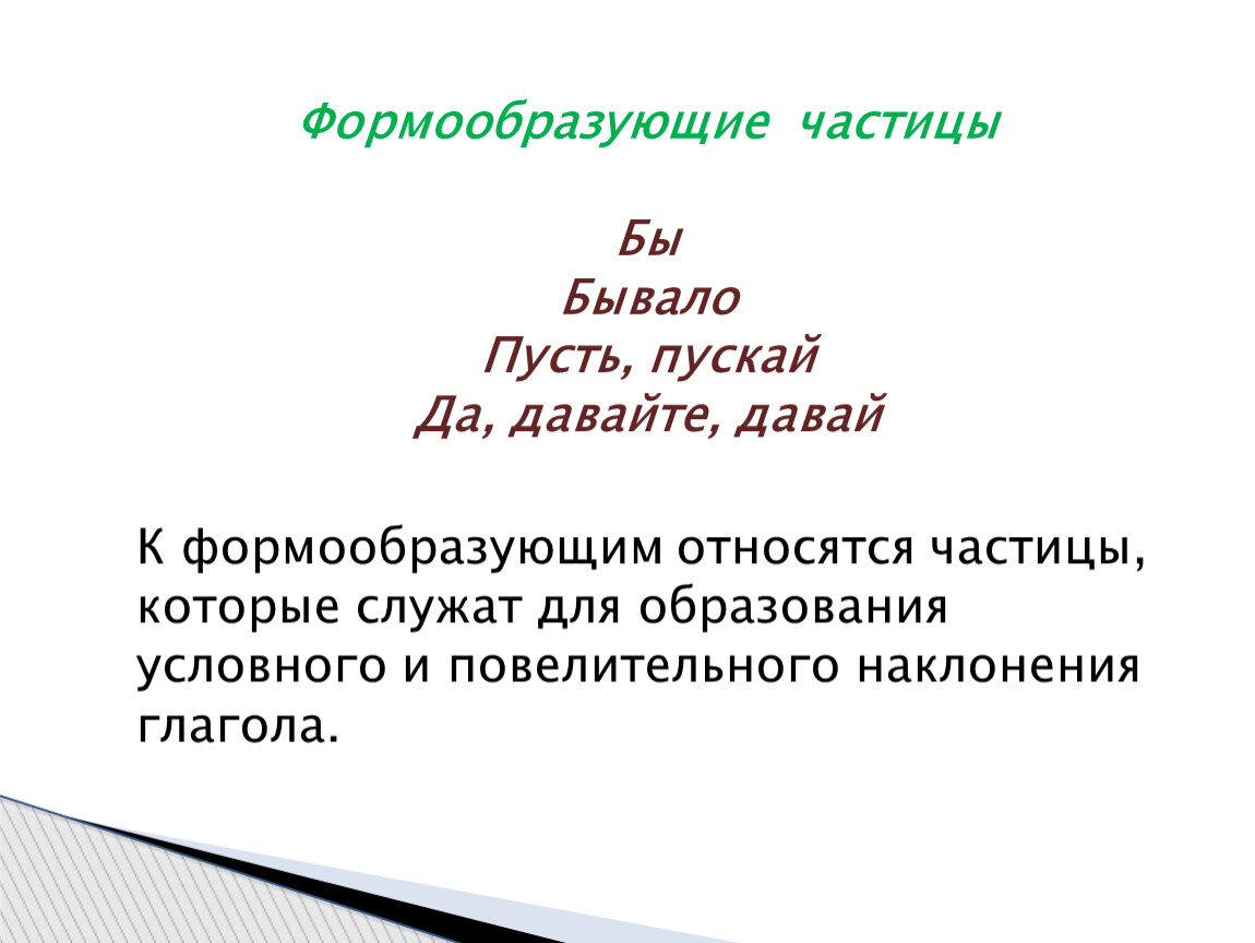 К формообразующим относятся частицы, которые служат для образования условного и повелительного наклонения глагола.