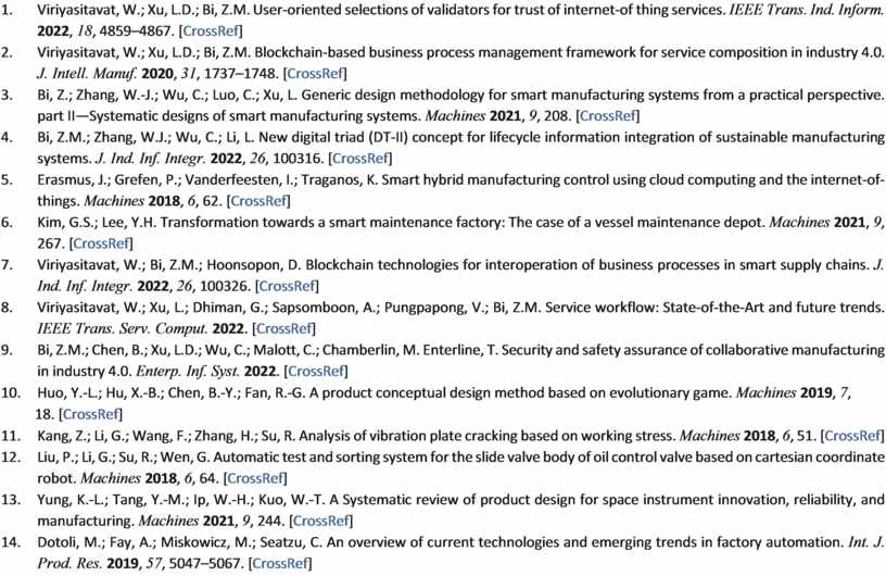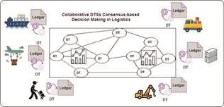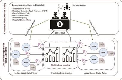 Sahal et al. [8] investigated the roles of digital twins (DTs) in modelling physical assets and supporting decision-making activities in decentralized and distributed manufacturing. They found that DTs required collaboration among stakeholders to reach the consensuses of decisions and predict risks; the critical FRs of collaborations were defined in terms of interoperability, authentication, scalability, and the avoidance of single-point failures. A ledger-based collaborative framework was proposed to fulfill the identified FRs in smart transportation systems, and the incorporated technologies included blockchain technologies (BCTs), predictive analysis techniques, and other digital technologies. Ubiquitous smart things in the Internet of Things (IoT) make it feasible to collect real-time data of the conditions of any manufacturing resources from anywhere at any time; Tan et al. [9] adopted DTs to synchronize and utilize real-time data in a cyber space; the challenges of
