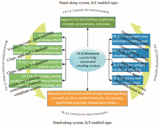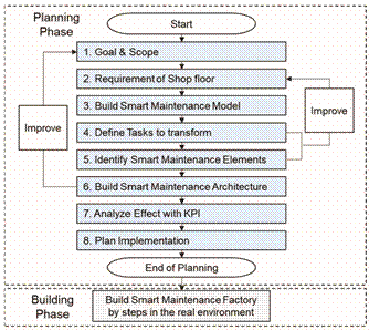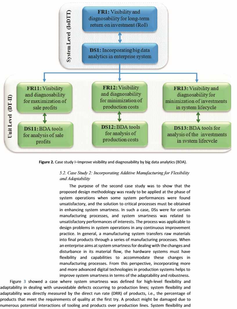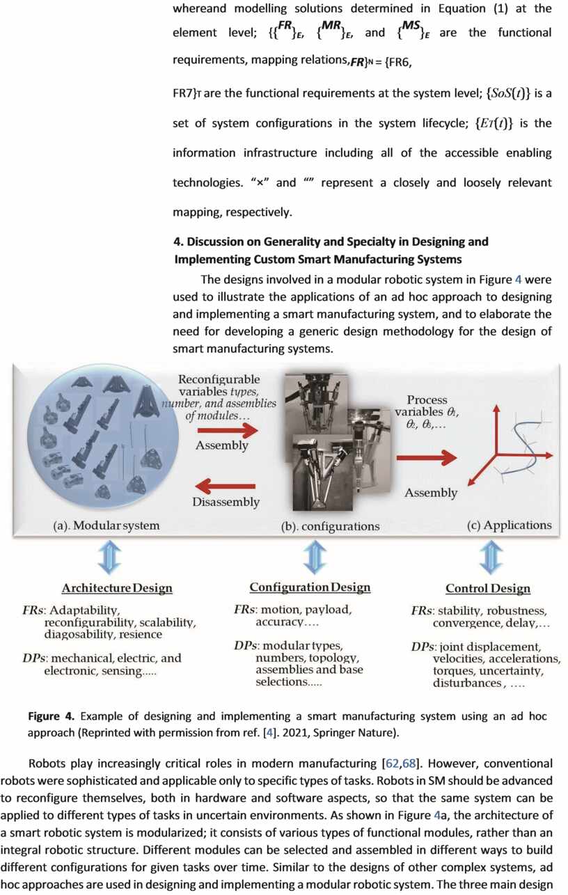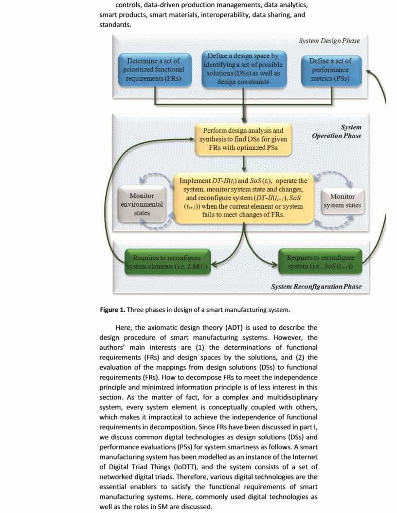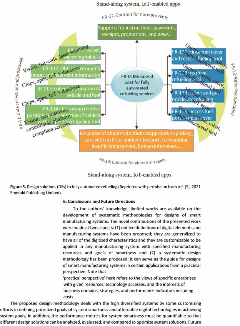 System design methods are used to select system elements, configure these elements into components and systems, and model, evaluate, and compare design options against key performance indicators (KPIs) for system optimization. However, traditional system design methods are mostly for the design of static systems with clear system boundaries. There are needs required for the advancement of system design methods so that a smart manufacturing system can be reconfigurable to achieve high-level smartness in its system lifecycle. The configurations of a smart system must be customized to the constraints of manufacturing resources and the prioritized KPIs. Bi et al. [14,15] proposed a systematic design methodology as the guide for designs of smart manufacturing systems in specified applications. The axiomatic design theory (ADT) was adopted and expanded to design, analyze, and assess smart manufacturing systems, and the applicability of the proposed methodology was verified using three case studies. Erasmus et al. [16] proposed an information architecture to integrate CC and IoT with smart devices for human–robot collaboration; the architecture was modularized for small- or medium-sized enterprises (SMEs) to access extensible cloud services, and it was used as a reference architecture for information management systems in Industry 4.0. The architecture was tested and evaluated with the information systems of ten real-world factories. Kim and Lee [17] extended the SM concept to a maintenance system in ship building and servicing; the framework, procedure, and architecture of a smart maintenance system were developed to systematically design large-scale SM systems.