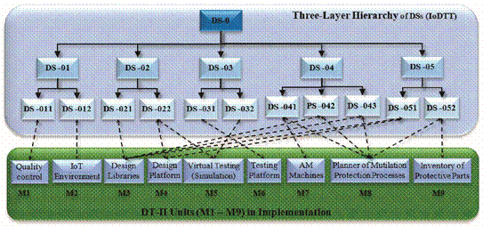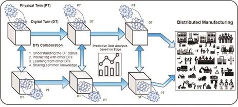 Industry 4.0 revolution is considered to be a new paradigm of digital, autonomous, and decentralized control with the Industrial Internet of Things (IIoT), Machine Learning (ML), big data, and edge computing [1,2]. For smart manufacturing, distributed manufacturing is a form of decentralized manufacturing practiced by enterprises using digitalization [3,4]. It uses an effective collaboration form in terms of information sharing, analytics, and collaborative decision-making in real-time. A Digital Twin technology (DT) is one of the core elements of manufacturing digitalization, representing a real-world system such as production systems in a virtual space [5]. Multiple DTs are used to represent a distributed production system in hierarchical levels [6]: (i) DTs in a flat network represent individual things at the machine level. They exchange information with each other on things and learn about their operation and behavior to build a common understanding of