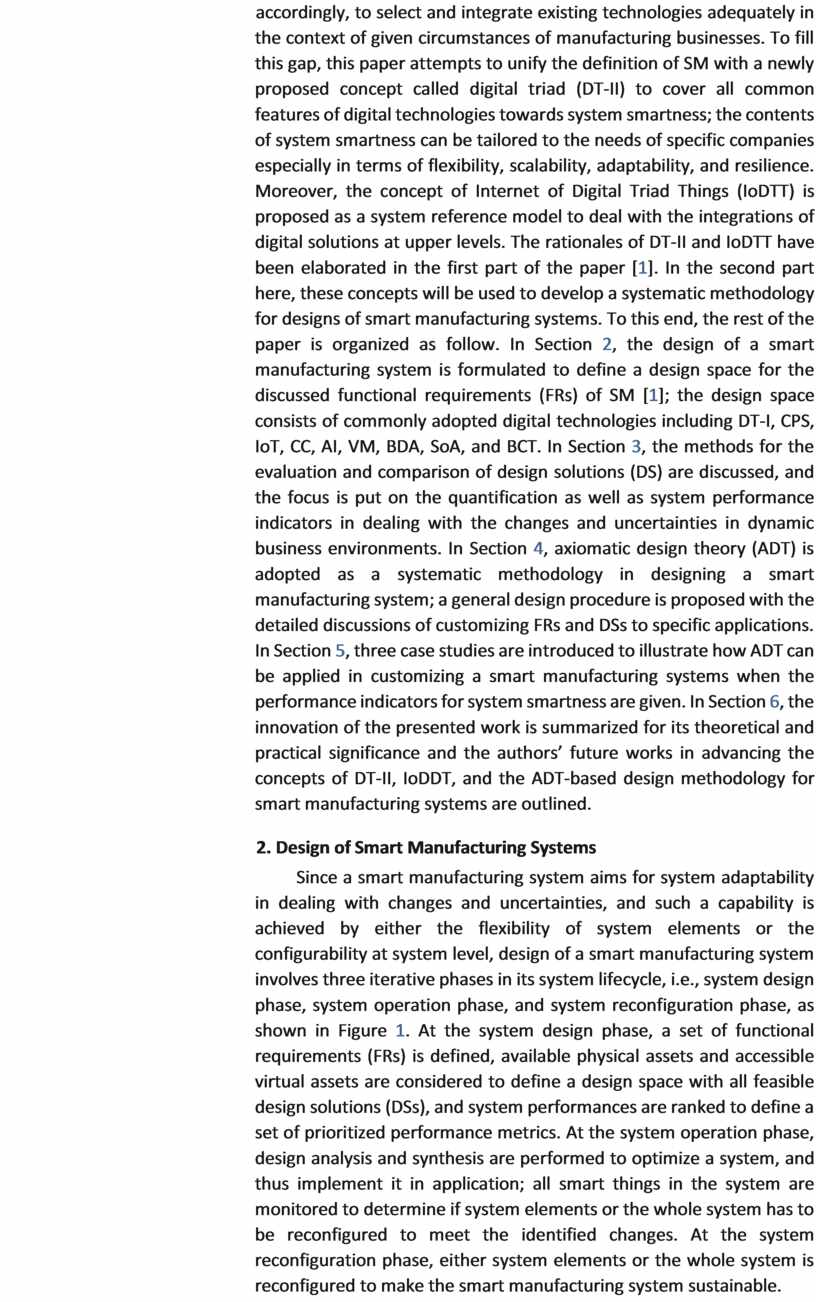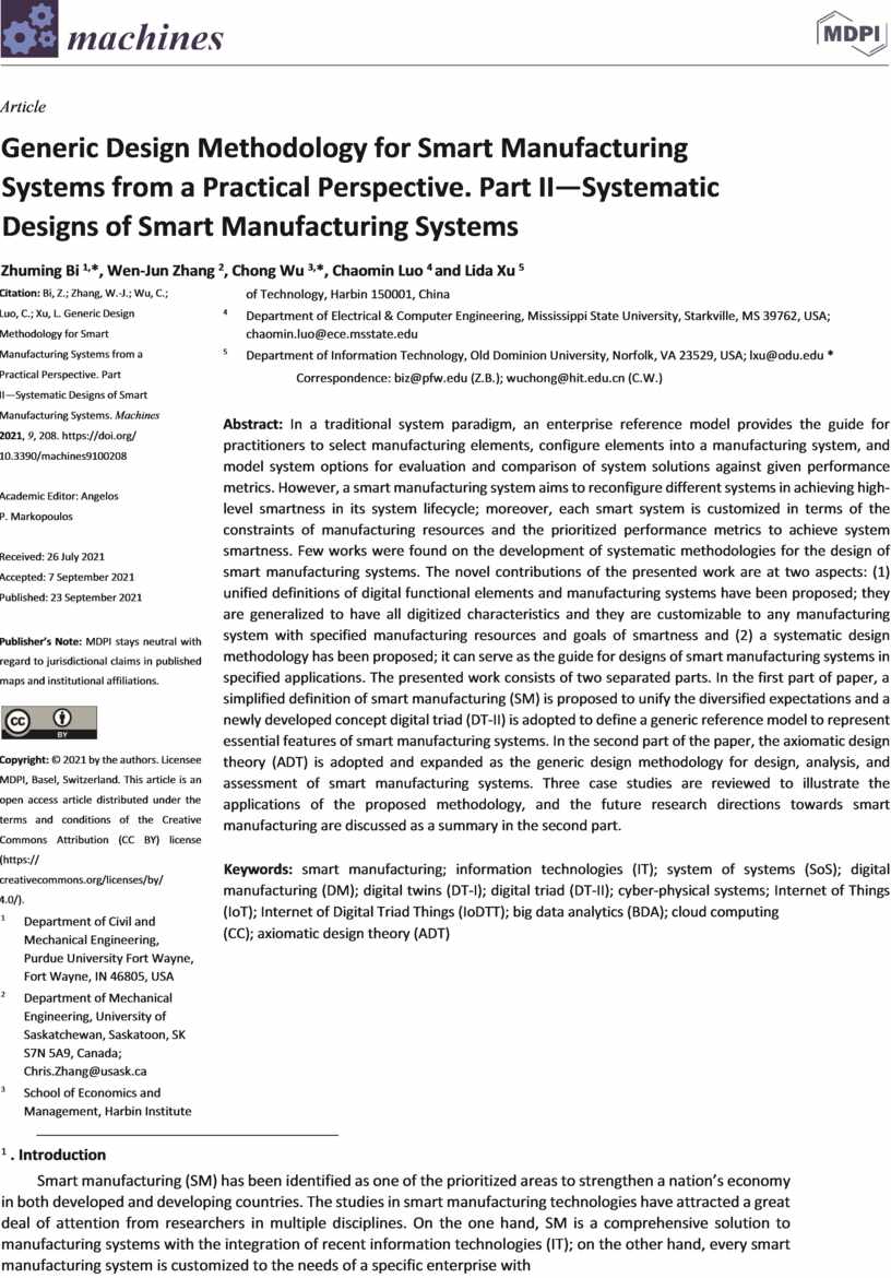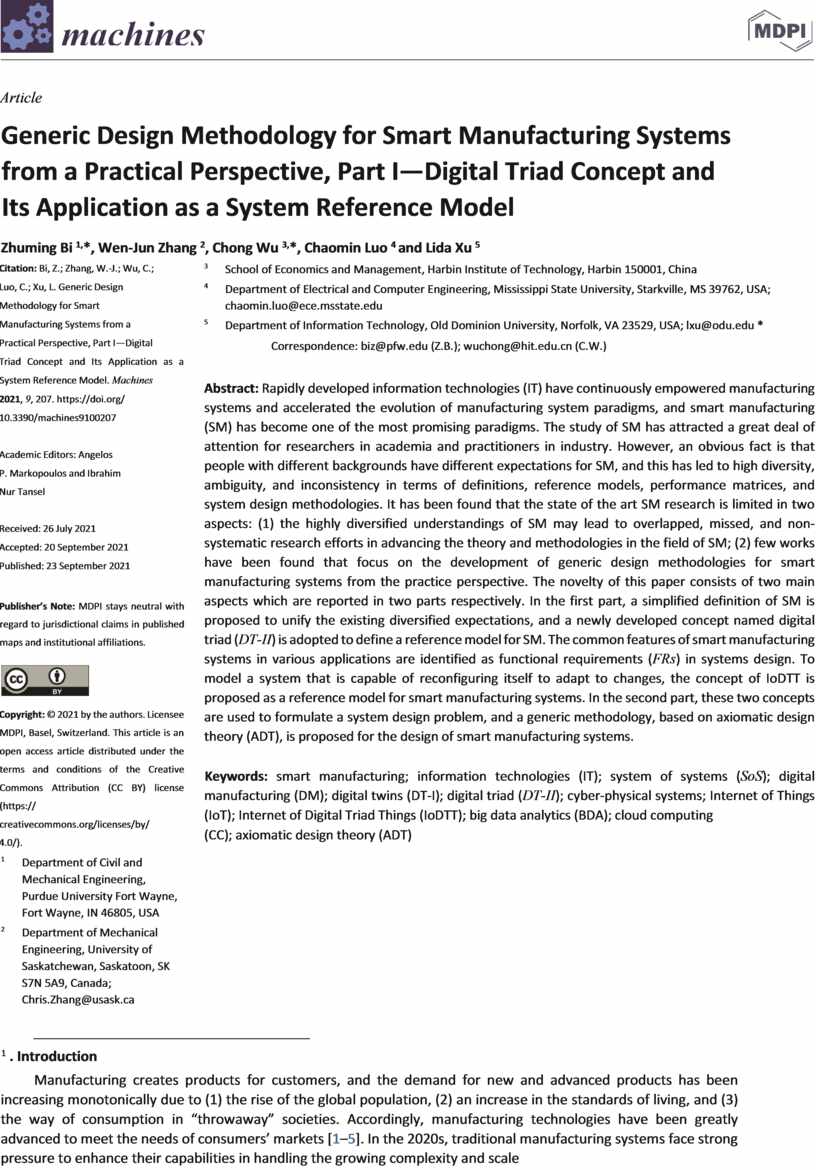 Rapidly developed digital technologies have continuously stimulated shifts of manufacturing system paradigms; most recently, the study of SM has attracted numerous researchers in academia and practitioners in industry [1–5]. However, people in different domains have highly diversified expectations of system smartness, leading to the ambiguity, diversity, and inconsistency of SM concepts in terms of system architecture, reference models, enabling technologies, and evaluation matrices. Bi et al. [6] generalized the definition of SM by unifying diversified expectations of system smartness as customizable measures, and they presented two concepts of digital triad (DT-II) and the Internet of Digital Triad Things (IoDTT) to emphasize the functional requirements (FRs) of SM to accommodate changes and uncertainties in sustainable and cost-effective ways. Bányai [7] analyzed the needs of adaptability and flexibility in matrix production; he argued that flexible manufacturing systems could be the correct solutions to deal with changes in production. He emphasized the importance of effective models and methods in optimizing system controls. In particular, he proposed a hybrid metaheuristic algorithm based on multiphase black hole and flower pollination to plan and schedule manufacturing resources in material handling systems using robots.