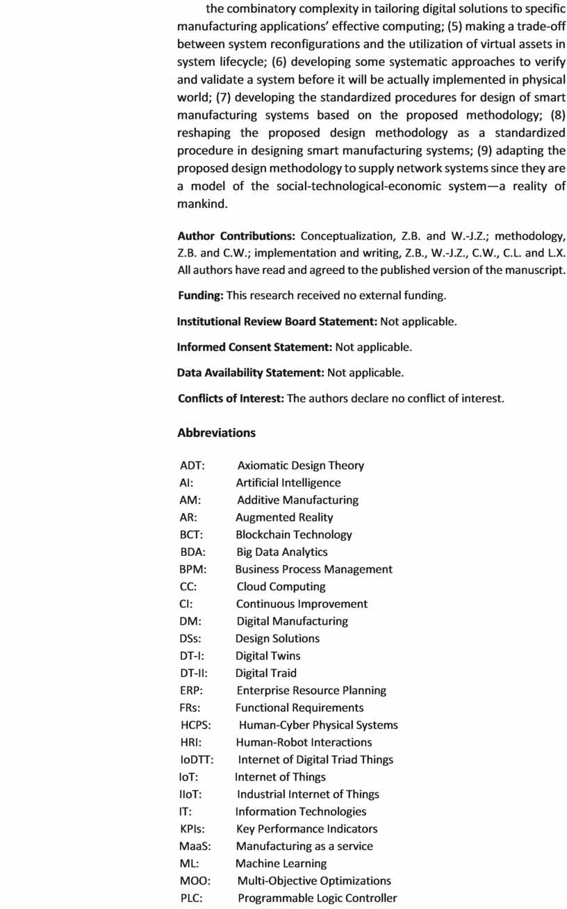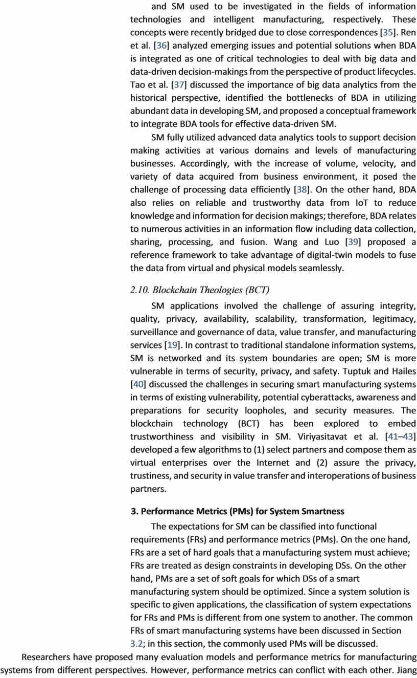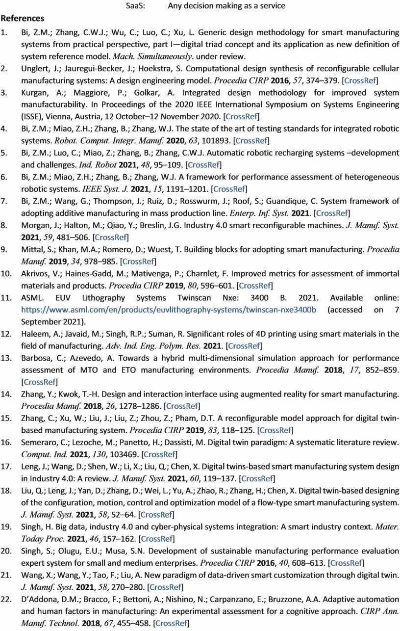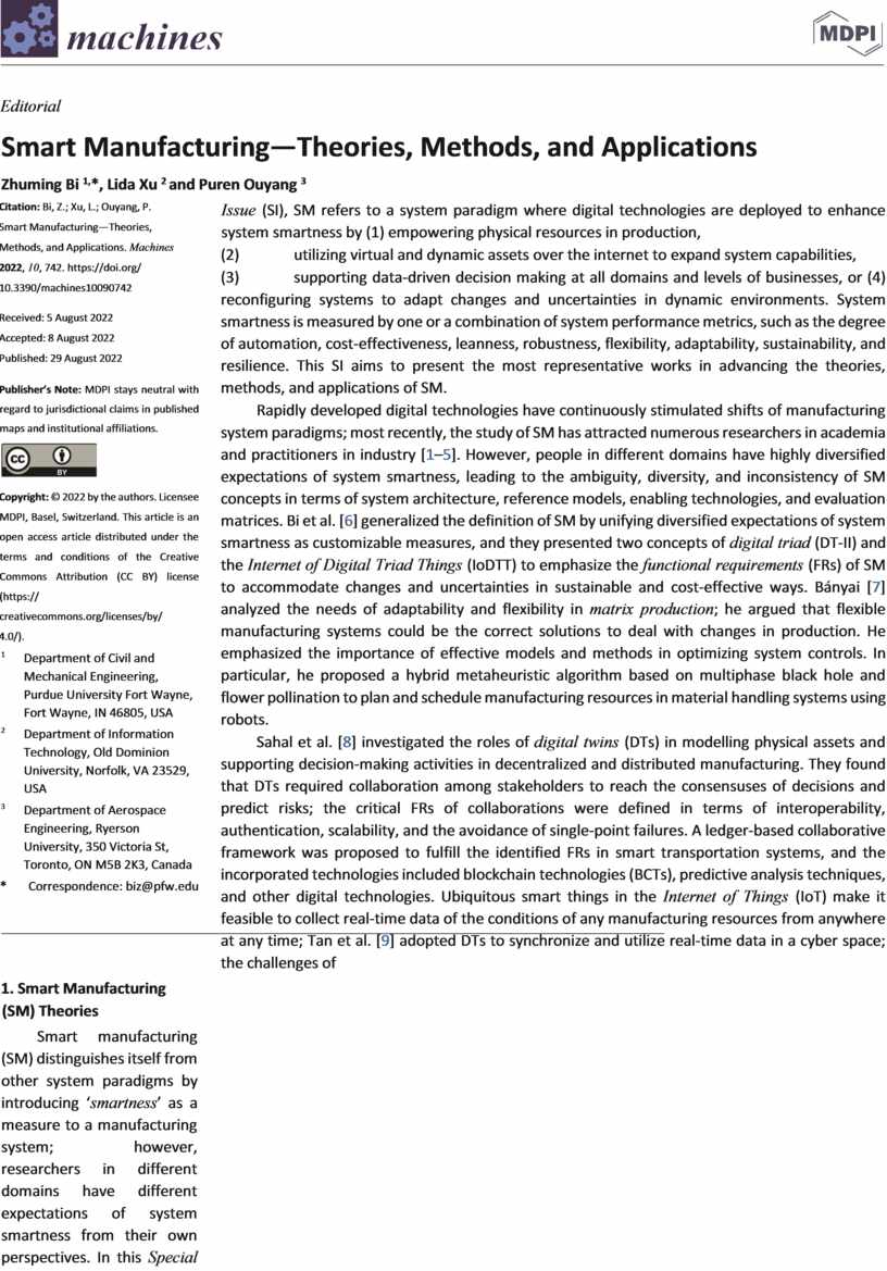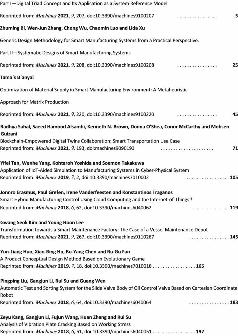 Increasingly more manufacturing enterprises are ready to incorporate newly developed technologies, such as DTs, CPSs, IoT, BDA, and BCT, with traditional manufacturing technologies, such as flexible manufacturing systems (FMSs), total quality management (TQM), supply chain management (SCM), enterprise resource planning (ERP), and computer-integrated manufacturing (CIM). However, existing theories, methods, and tools still exhibit limitations in supporting cost-effective vertical integration, decentralization, smart sensing and actuating, autonomy and self-organization, and uses of semantic models [25]. The research of SM in theories, methods, and applications should be advanced to transfer integrated digital technologies into productivity, profitability, and sustainability of systems. This Editorial Team anticipated that future research in SM would mainly incorporate areas of (1) ubiquitous sensing, (2) fusing and integrating data from heterogeneous sources, (3) effective BDA methods, (4) data visualization methods for human interactions, (5) data-driven decision-making supports, (6) workflow composition methods, (7) the standardization and specifications of smart modules, and (8) quantified criteria such as adaptability, sustainability, and resilience for system evaluation [1,6,14].