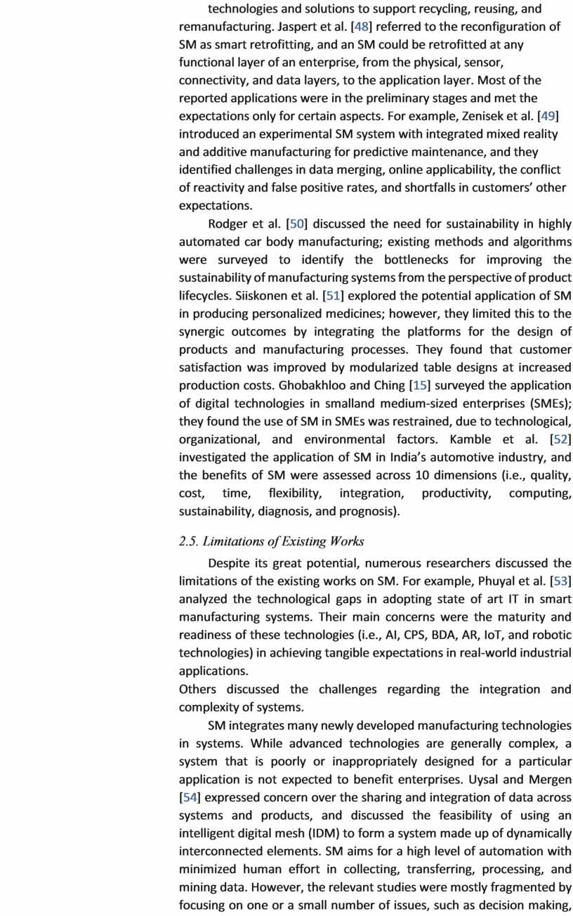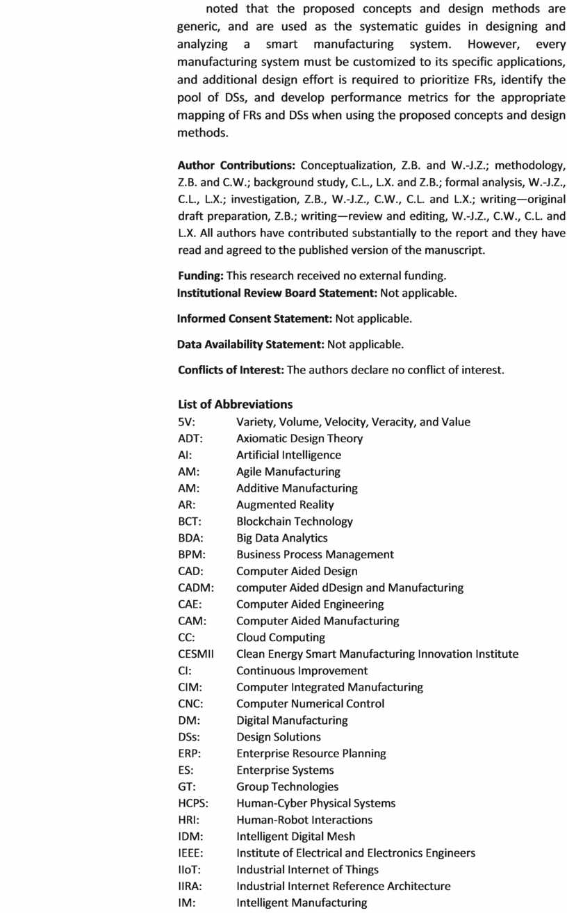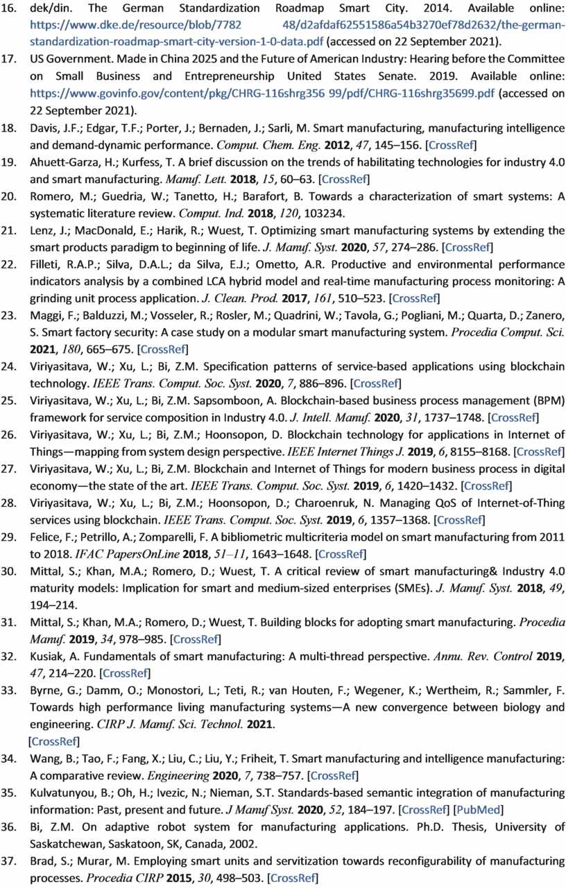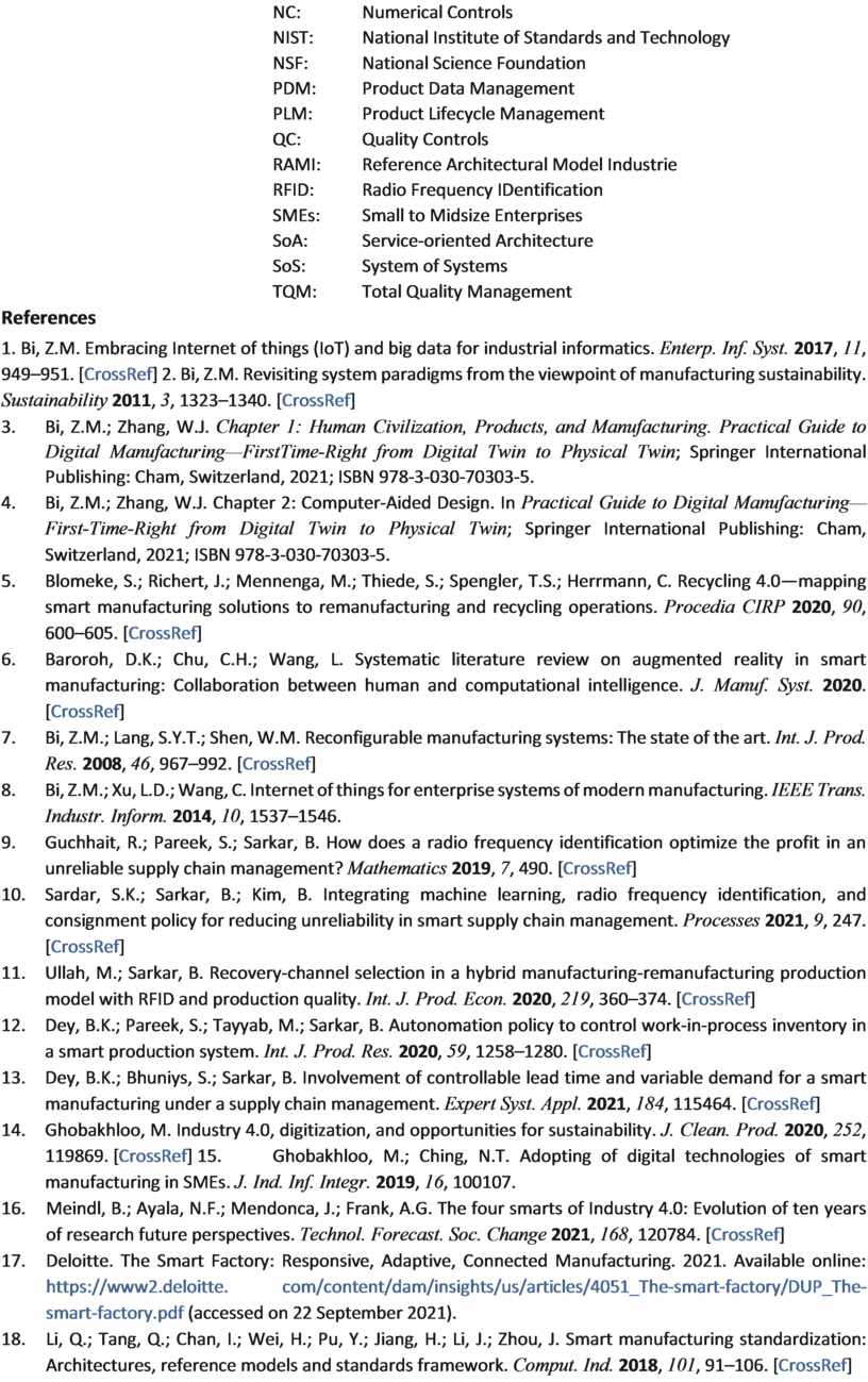 Increasingly more manufacturing enterprises are ready to incorporate newly developed technologies, such as DTs, CPSs, IoT, BDA, and BCT, with traditional manufacturing technologies, such as flexible manufacturing systems (FMSs), total quality management (TQM), supply chain management (SCM), enterprise resource planning (ERP), and computer-integrated manufacturing (CIM). However, existing theories, methods, and tools still exhibit limitations in supporting cost-effective vertical integration, decentralization, smart sensing and actuating, autonomy and self-organization, and uses of semantic models [25]. The research of SM in theories, methods, and applications should be advanced to transfer integrated digital technologies into productivity, profitability, and sustainability of systems. This Editorial Team anticipated that future research in SM would mainly incorporate areas of (1) ubiquitous sensing, (2) fusing and integrating data from heterogeneous sources, (3) effective BDA methods, (4) data visualization methods for human interactions, (5) data-driven decision-making supports, (6) workflow composition methods, (7) the standardization and specifications of smart modules, and (8) quantified criteria such as adaptability, sustainability, and resilience for system evaluation [1,6,14].