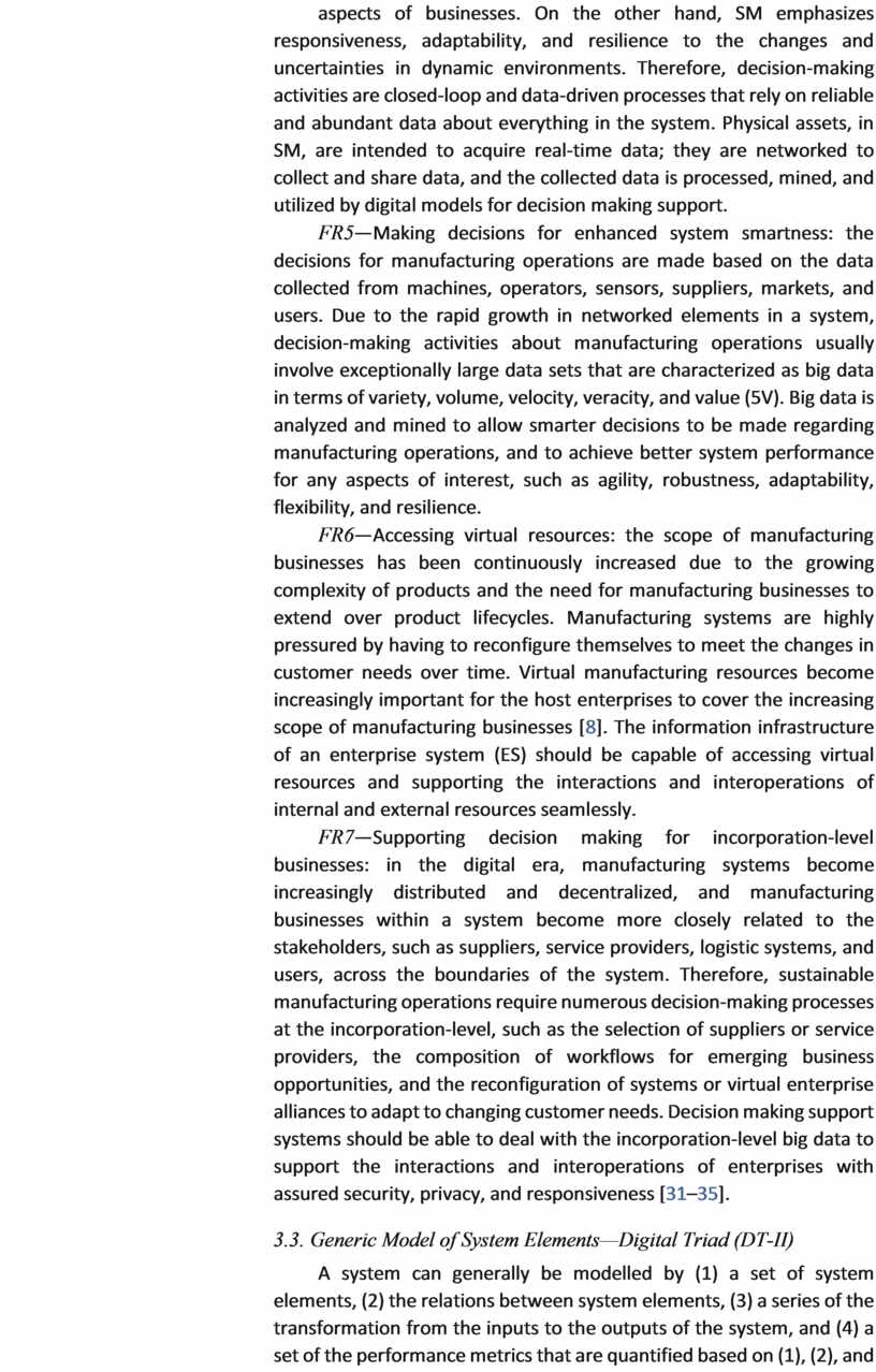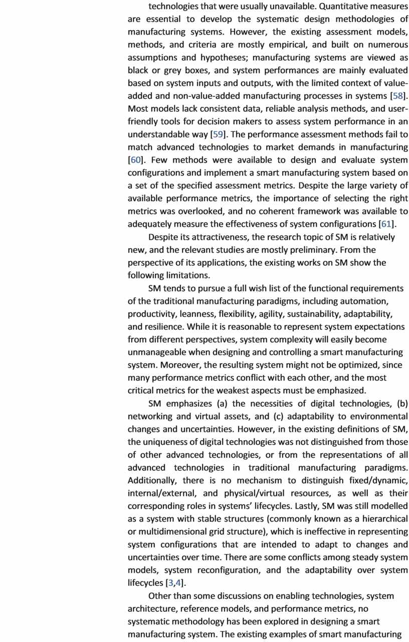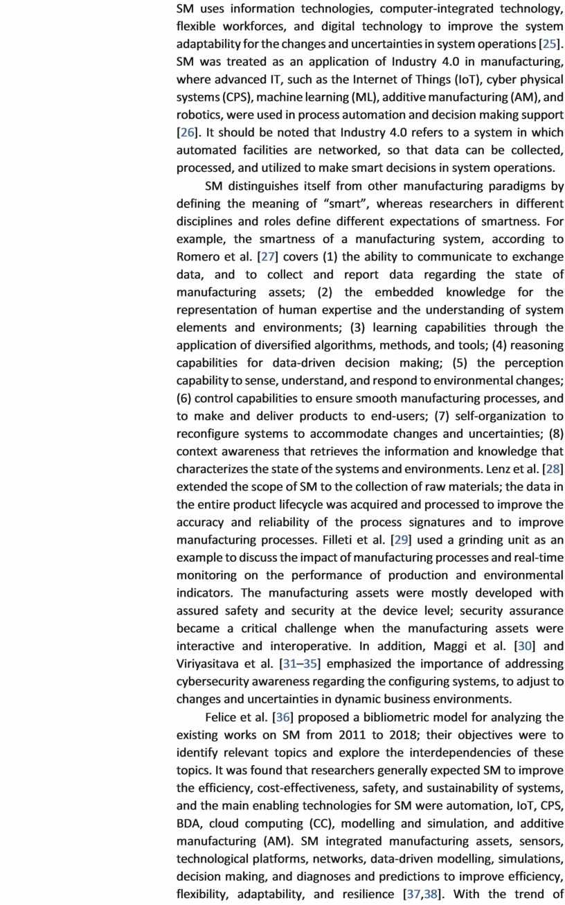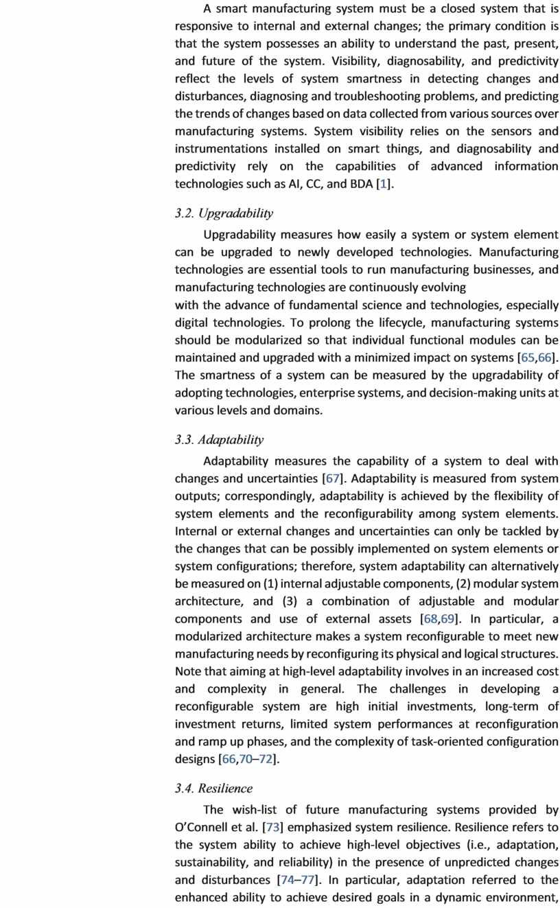 SM is expected to meet some emerging requirements of automation, adaptability, sustainability, and resilience of modern manufacturing systems in the digital era at numerous aspects, including (1) dealing with any level of system complexity relating to the number and variants of system elements, the interactions of system elements, and anticipated and unanticipated changes over time; (2) maximizing system entropy to adopt changes in a dynamic environment; (3) responding to real-time changes in the shortest possible time; (4) monitoring, diagnosing, and predicting system states and trends, generating preventive solutions for adverse changes, and upgrading systems to adapt preferable changes;