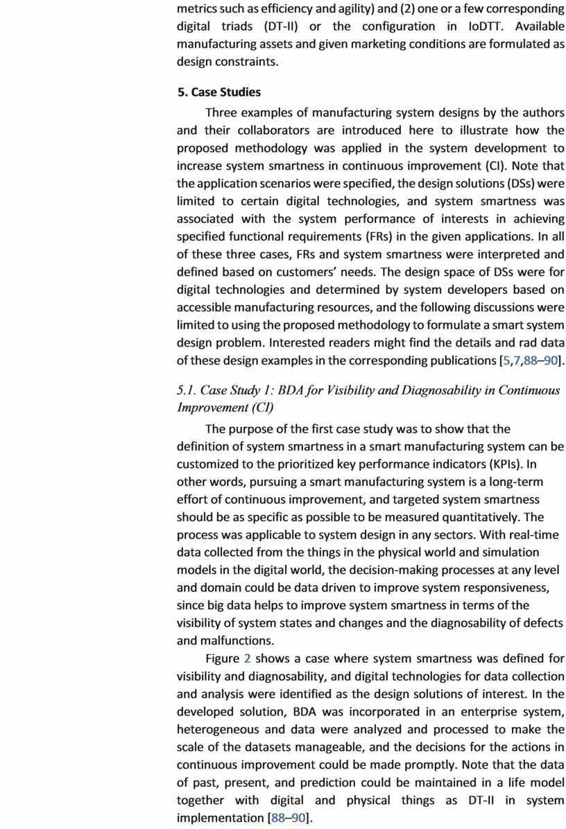 (3) supporting data-driven decision making at all domains and levels of businesses, or (4) reconfiguring systems to adapt changes and uncertainties in dynamic environments. System smartness is measured by one or a combination of system performance metrics, such as the degree of automation, cost-effectiveness, leanness, robustness, flexibility, adaptability, sustainability, and resilience. This SI aims to present the most representative works in advancing the theories, methods, and applications of SM.