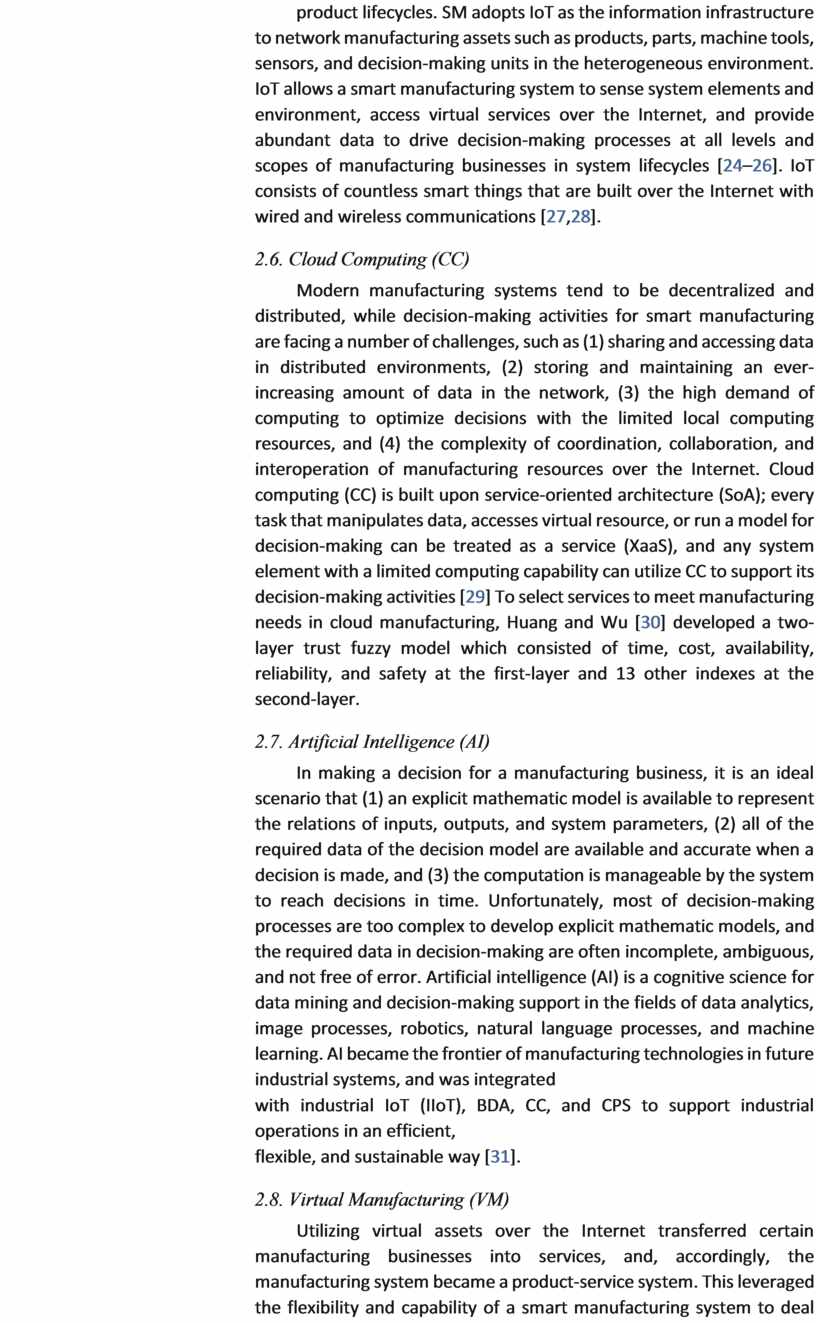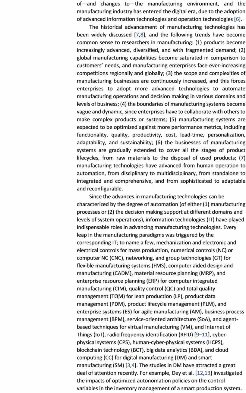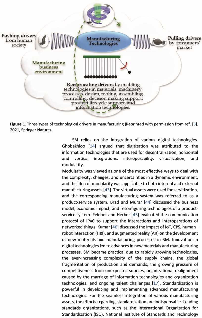 SM has benefited greatly from rapidly developed information technologies, such as DTs, BCT, IoT, cloud computing (CC), big data analytics (BDA), cyber-physical systems (CPSs), and edge-computing. These technologies have been changing the landscape of the research and development of SM radically, in a sense that (1) solutions of acquiring and transferring data become increasingly more affordable in regards to implementing, deploying, and integrating ‘smarter’ things in a system; (2) business-relevant data become increasingly bigger in terms of ‘volume’, ‘variety’, and ‘velocity’, where advanced data analytics can be used to capture, store, process, and utilize data to cope with changes in dynamic environments; (3) the system boundary becomes increasingly vaguer, and system architecture has to be dynamically adaptable to physical and virtual collaborations of business partners over time [10–13].