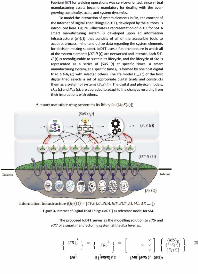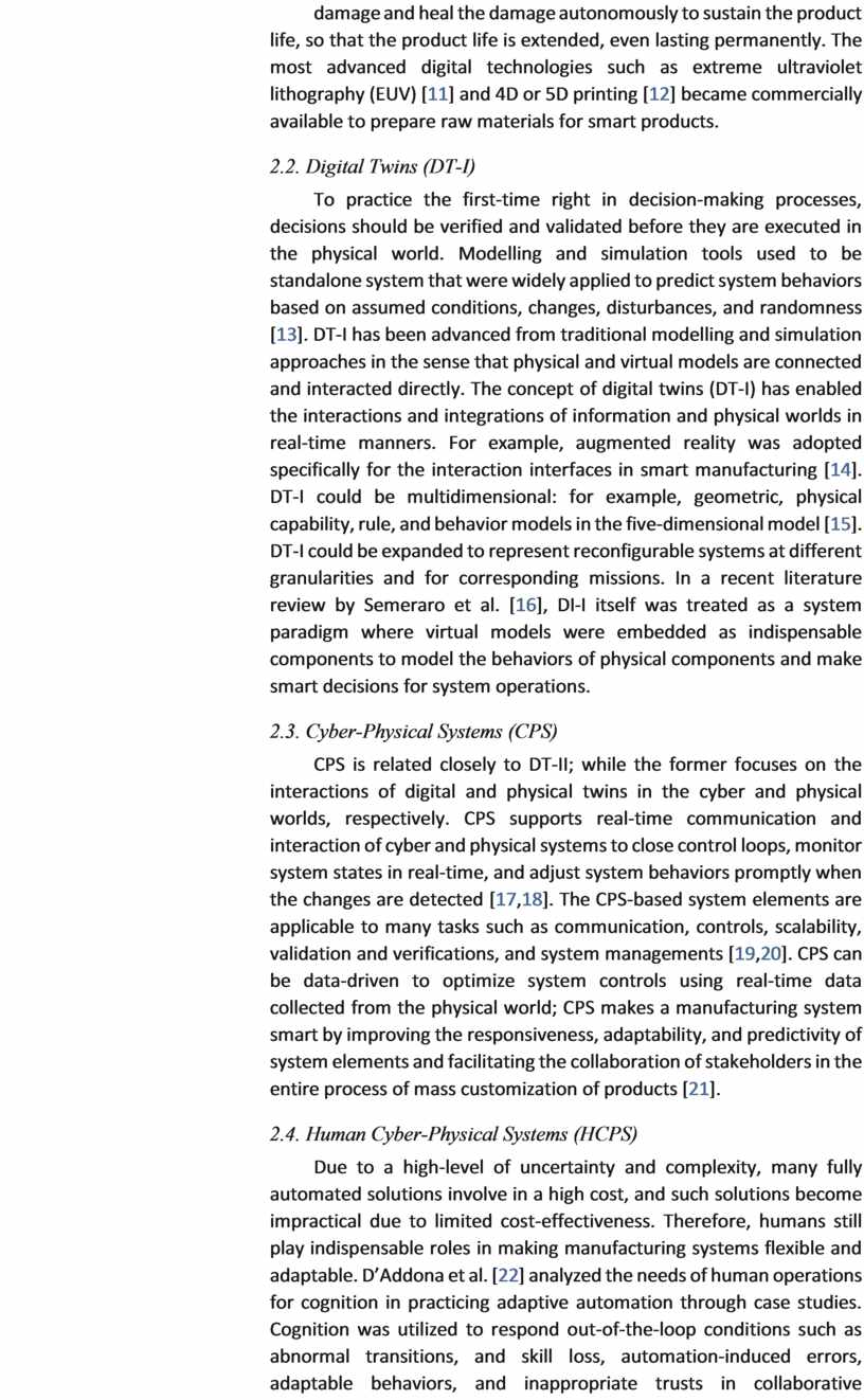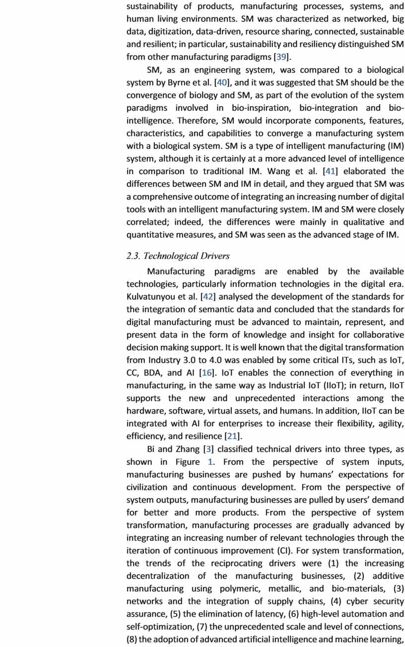 SM has benefited greatly from rapidly developed information technologies, such as DTs, BCT, IoT, cloud computing (CC), big data analytics (BDA), cyber-physical systems (CPSs), and edge-computing. These technologies have been changing the landscape of the research and development of SM radically, in a sense that (1) solutions of acquiring and transferring data become increasingly more affordable in regards to implementing, deploying, and integrating ‘smarter’ things in a system; (2) business-relevant data become increasingly bigger in terms of ‘volume’, ‘variety’, and ‘velocity’, where advanced data analytics can be used to capture, store, process, and utilize data to cope with changes in dynamic environments; (3) the system boundary becomes increasingly vaguer, and system architecture has to be dynamically adaptable to physical and virtual collaborations of business partners over time [10–13].