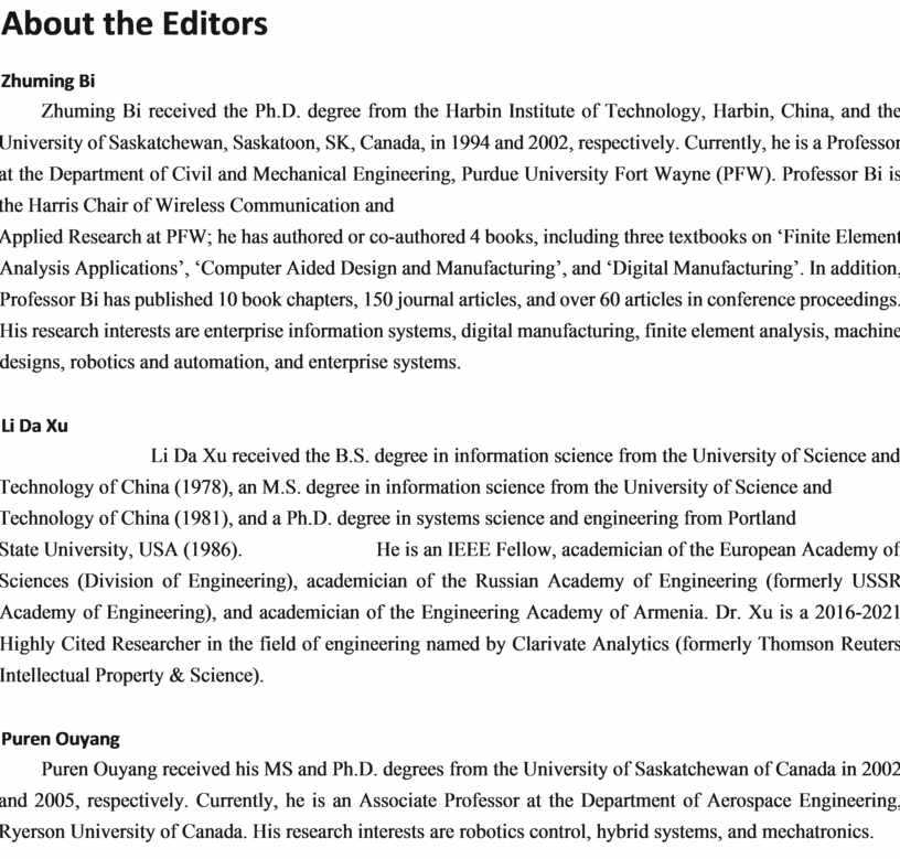 Applied Research at PFW; he has authored or co-authored 4 books, including three textbooks on ‘Finite Element Analysis Applications’, ‘Computer Aided Design and Manufacturing’, and ‘Digital Manufacturing’. In addition, Professor Bi has published 10 book chapters, 150 journal articles, and over 60 articles in conference proceedings. His research interests are enterprise information systems, digital manufacturing, finite element analysis, machine designs, robotics and automation, and enterprise systems.