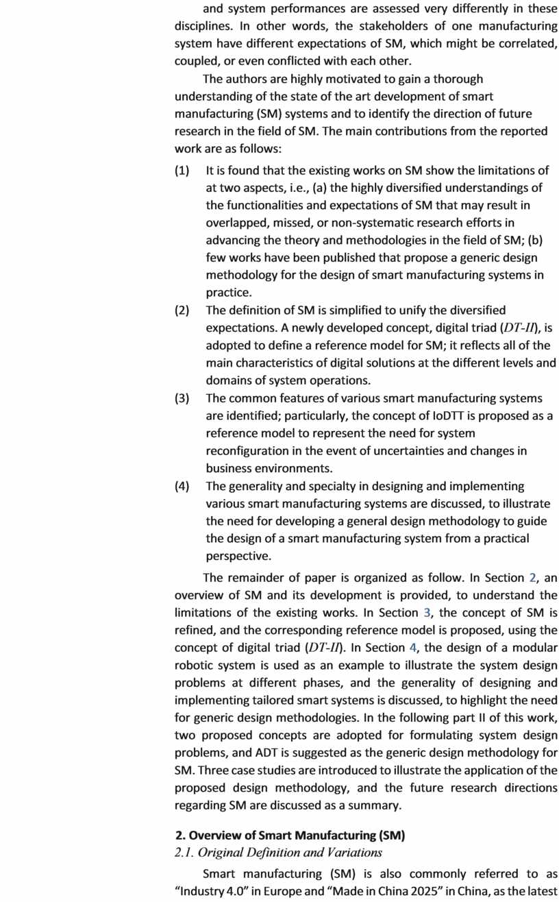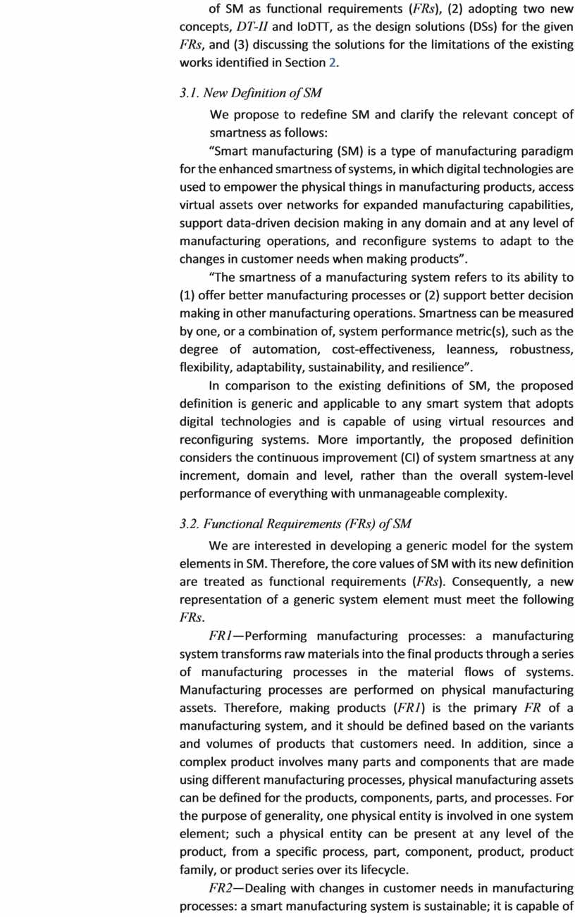 Smart manufacturing (SM) distinguishes itself from other system paradigms by introducing ‘smartness’ as a measure to a manufacturing system; however, researchers in different domains have different expectations of system smartness from their own perspectives. In this Special Issue (SI), SM refers to a system paradigm where digital technologies are deployed to enhance system smartness by (1) empowering physical resources in production,