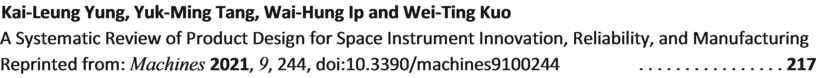 with the purpose of cost-efficiency. The proposed system consisted of two-terminal manipulators for parallel sorting processes, and it was seamlessly integrated in an automated assembly system to perform sorting tasks consistently in a shortened cycle time. Yung et al. [24] discussed the challenges in designing and manufacturing highly diversified space instruments. The specifications of space instruments were greatly distinguished from those of products on Earth, and careful considerations had to be determined on the size, weight, cost, complexity, and extreme space environments. A systematic literature search method was used to look into the impact of product design and innovation on the development of space instruments; the survey provided important information and critical considerations for using cutting-edge digital technologies in designing and manufacturing space instruments.