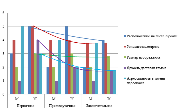 Полученные результаты диагностирования агрессивности (при первичной, промежуточной и конечной диагностиках) за период проведения курса реабилитации позволяют утверждать, что у мальчиков из исследуемой выборки детей преобладает вербальная агрессия, при этом доминирования вербальной агрессии у девочек не обнаружено.