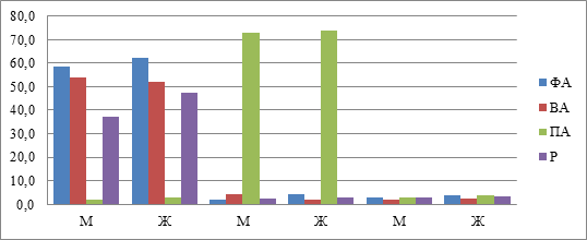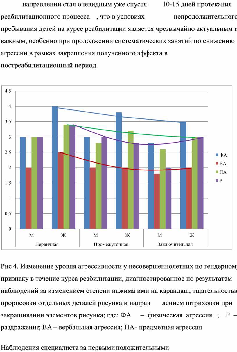 Рис 4. Изменение уровня агрессивности у несовершеннолетних по гендерному признаку в течение курса реабилитации, диагностированное по результатам наблюдений за изменением степени нажима ими на карандаш, тщательностью прорисовки отдельных деталей рисунка и направлением штриховки при закрашивании элементов рисунка; где: ФА – физическая агрессия; Р – раздражение; ВА – вербальная агрессия; ПА- предметная агрессия