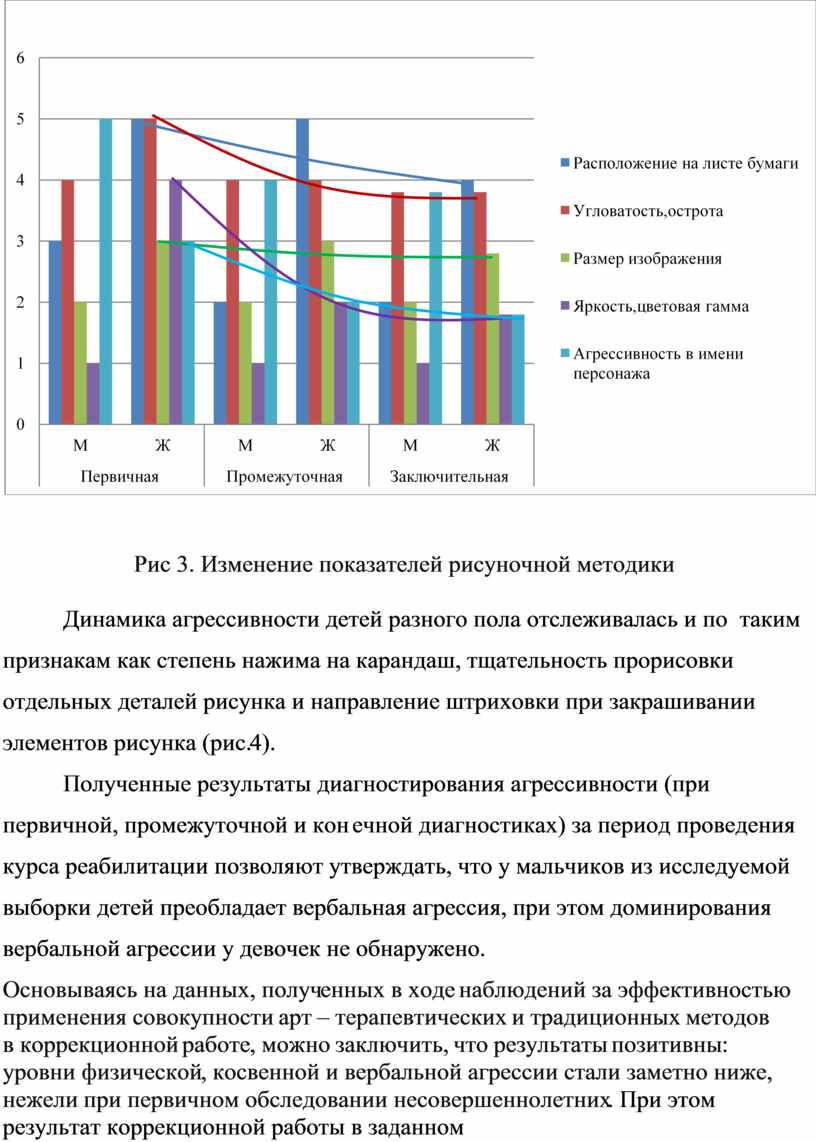 Основываясь на данных, полученных в ходе наблюдений за эффективностью применения совокупности арт – терапевтических и традиционных методов в коррекционной работе, можно заключить, что результаты позитивны: уровни физической, косвенной и вербальной агрессии стали заметно ниже, нежели при первичном обследовании несовершеннолетних. При этом результат коррекционной работы в заданном направлении стал очевидным уже спустя 10-15 дней протекания реабилитационного процесса, что в условиях непродолжительного пребывания детей на курсе реабилитации является чрезвычайно актуальным и важным, особенно при продолжении систематических занятий по снижению агрессии в рамках закрепления полученного эффекта в постреабилитационный период.