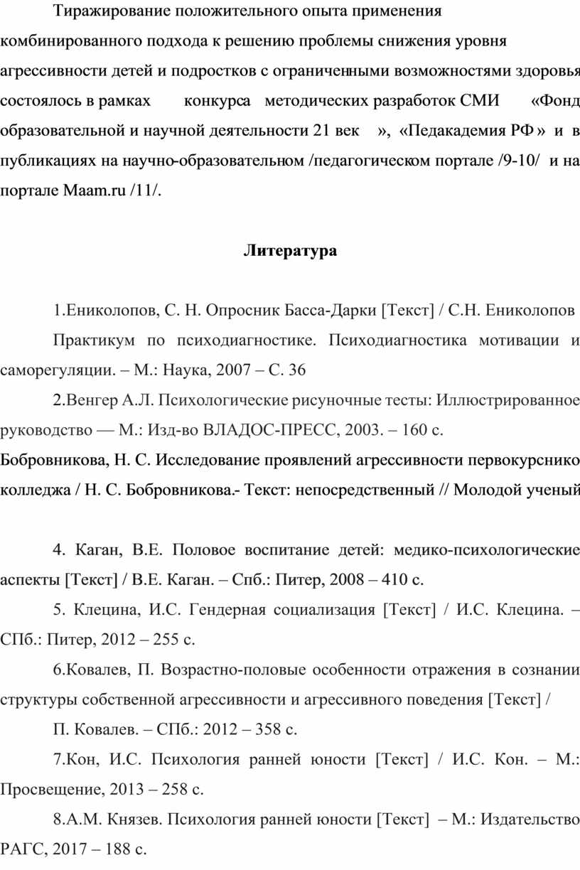 1.Ениколопов, С. Н. Опросник Басса-Дарки [Текст] / С.Н. Ениколопов