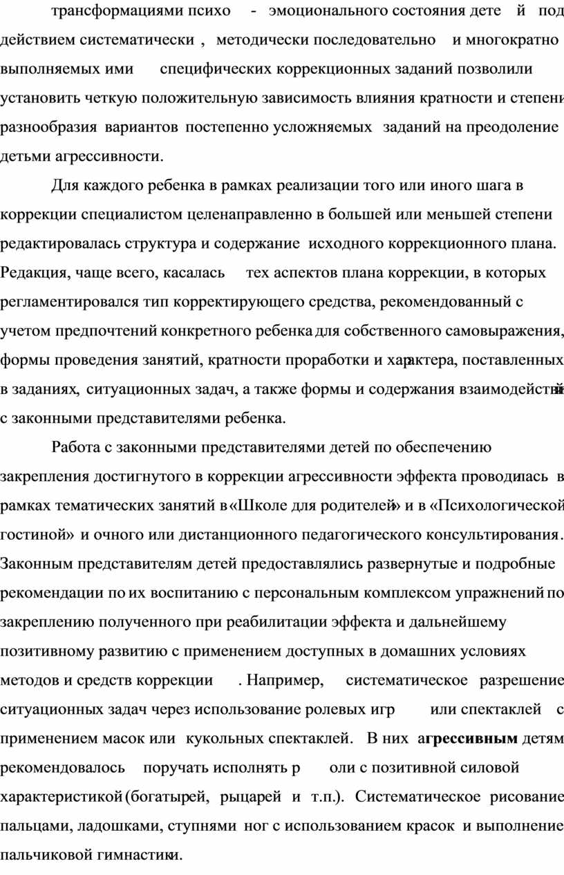 Работа с законными представителями детей по обеспечению закрепления достигнутого в коррекции агрессивности эффекта проводилась в рамках тематических занятий в «Школе для родителей» и в «Психологической гостиной» и очного или дистанционного педагогического консультирования. Законным представителям детей предоставлялись развернутые и подробные рекомендации по их воспитанию с персональным комплексом упражнений по закреплению полученного при реабилитации эффекта и дальнейшему позитивному развитию с применением доступных в домашних условиях методов и средств коррекции. Например, систематическое разрешение ситуационных задач через использование ролевых игр или спектаклей с применением масок или кукольных спектаклей. В них агрессивным детям рекомендовалось поручать исполнять роли с позитивной силовой характеристикой (богатырей, рыцарей и т.п.). Систематическое рисование пальцами, ладошками, ступнями ног с использованием красок и выполнение пальчиковой гимнастики.