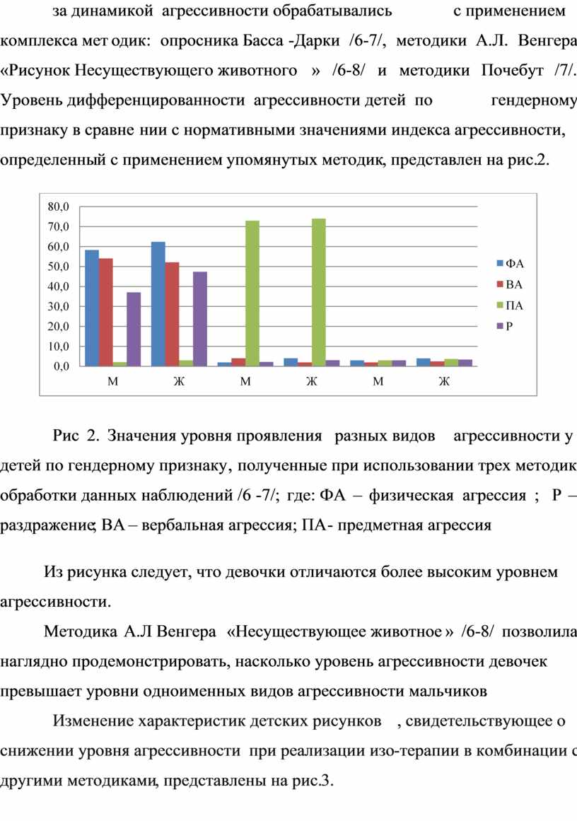 Рис 2. Значения уровня проявления разных видов агрессивности у детей по гендерному признаку, полученные при использовании трех методик обработки данных наблюдений /6-7/; где: ФА – физическая агрессия; Р – раздражение; ВА – вербальная агрессия; ПА- предметная агрессия