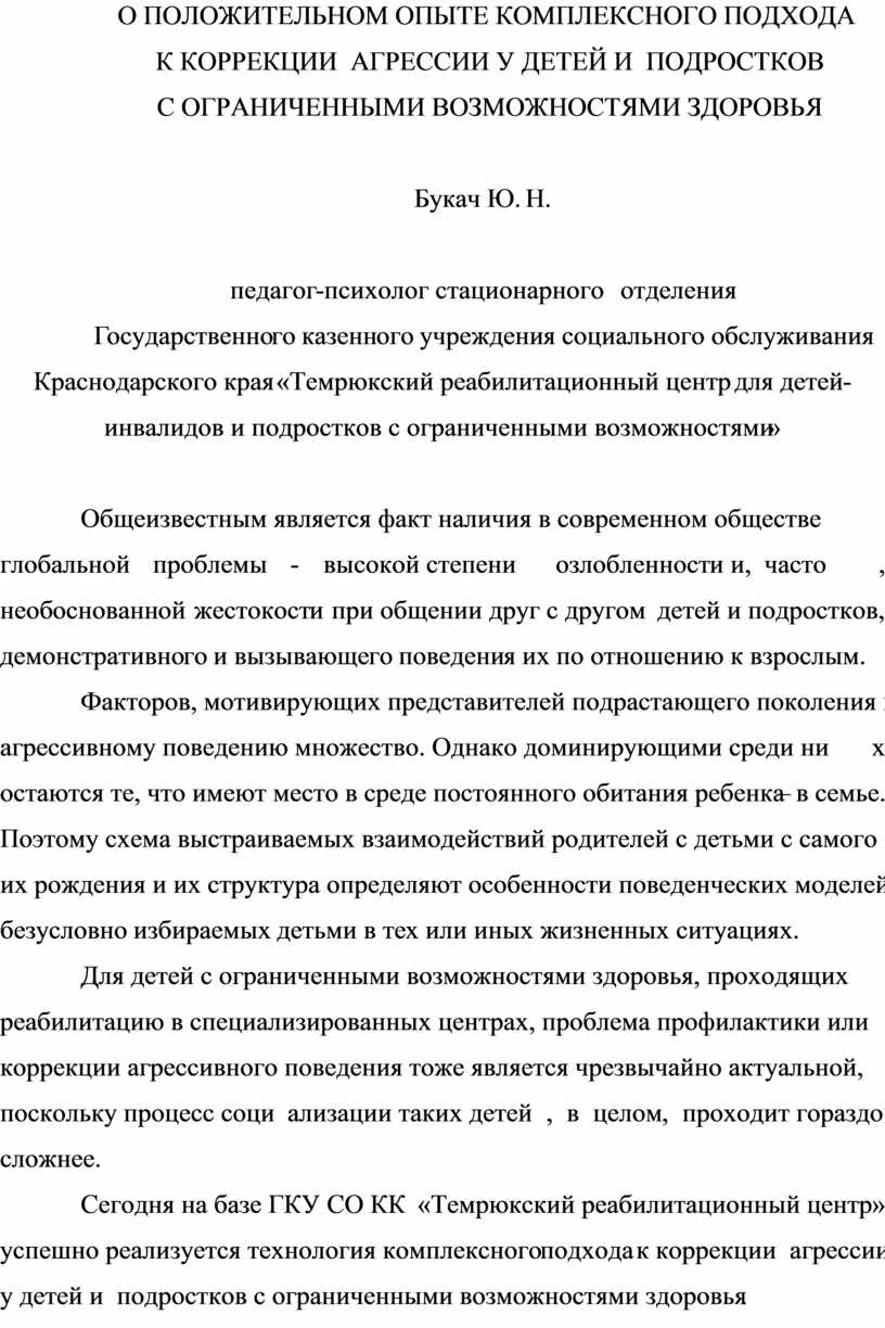 Сегодня на базе ГКУ СО КК «Темрюкский реабилитационный центр» успешно реализуется технология комплексного подхода к коррекции агрессии у детей и подростков с ограниченными возможностями здоровья.