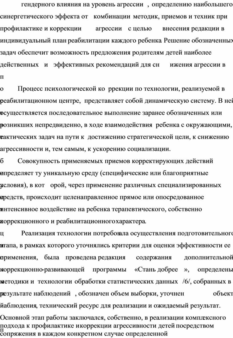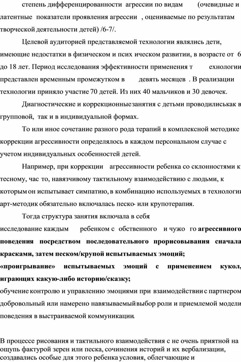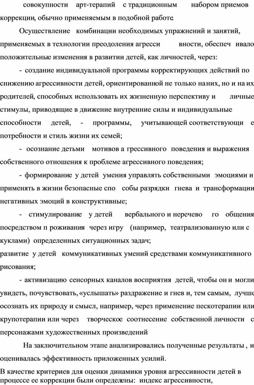 То или иное сочетание разного рода терапий в комплексной методике коррекции агрессивности определялось в каждом персональном случае с учетом индивидуальных особенностей детей.