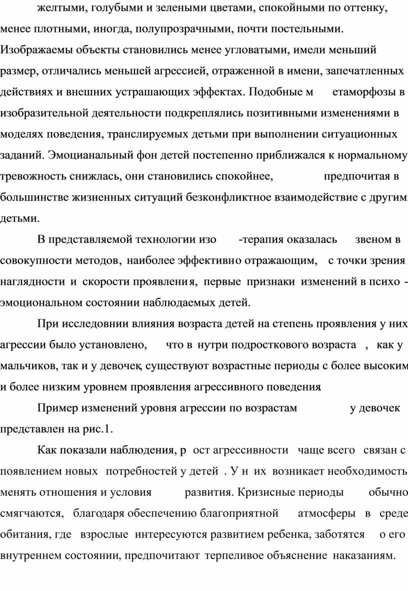 В представляемой технологии изо-терапия оказалась звеном в совокупности методов, наиболее эффективно отражающим, с точки зрения наглядности и скорости проявления, первые признаки изменений в психо-эмоциональном состоянии наблюдаемых детей.
