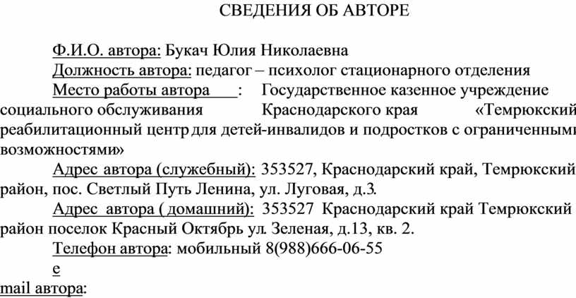 Место работы автора: Государственное казенное учреждение социального обслуживания Краснодарского края «Темрюкский реабилитационный центр для детей-инвалидов и подростков с ограниченными возможностями»