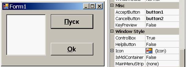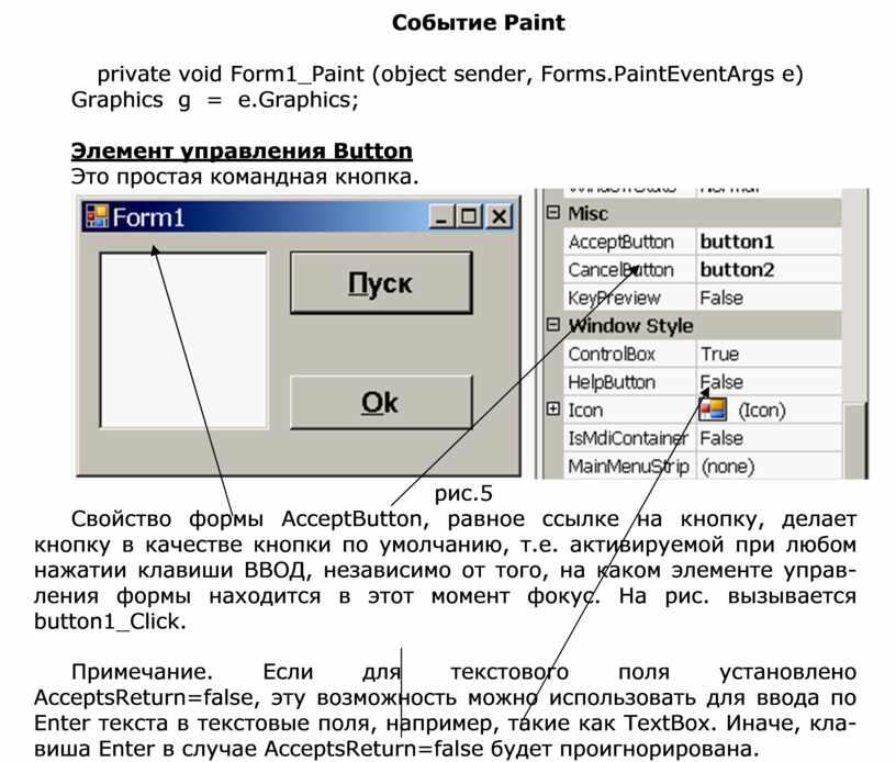 Свойство формы AcceptButton, равное ссылке на кнопку, делает кнопку в качестве кнопки по умолчанию, т.е. активируемой при любом нажатии клавиши ВВОД, независимо от того, на каком элементе управ- ления формы находится в этот момент фокус. На рис. вызывается button1_Click.