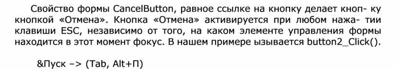 Свойство формы CancelButton, равное ссылке на кнопку делает кноп- ку кнопкой «Отмена». Кнопка «Отмена» активируется при любом нажа- тии клавиши ESC, независимо от того, на каком элементе управления формы находится в этот момент фокус. В нашем примере ызывается button2_Click().
