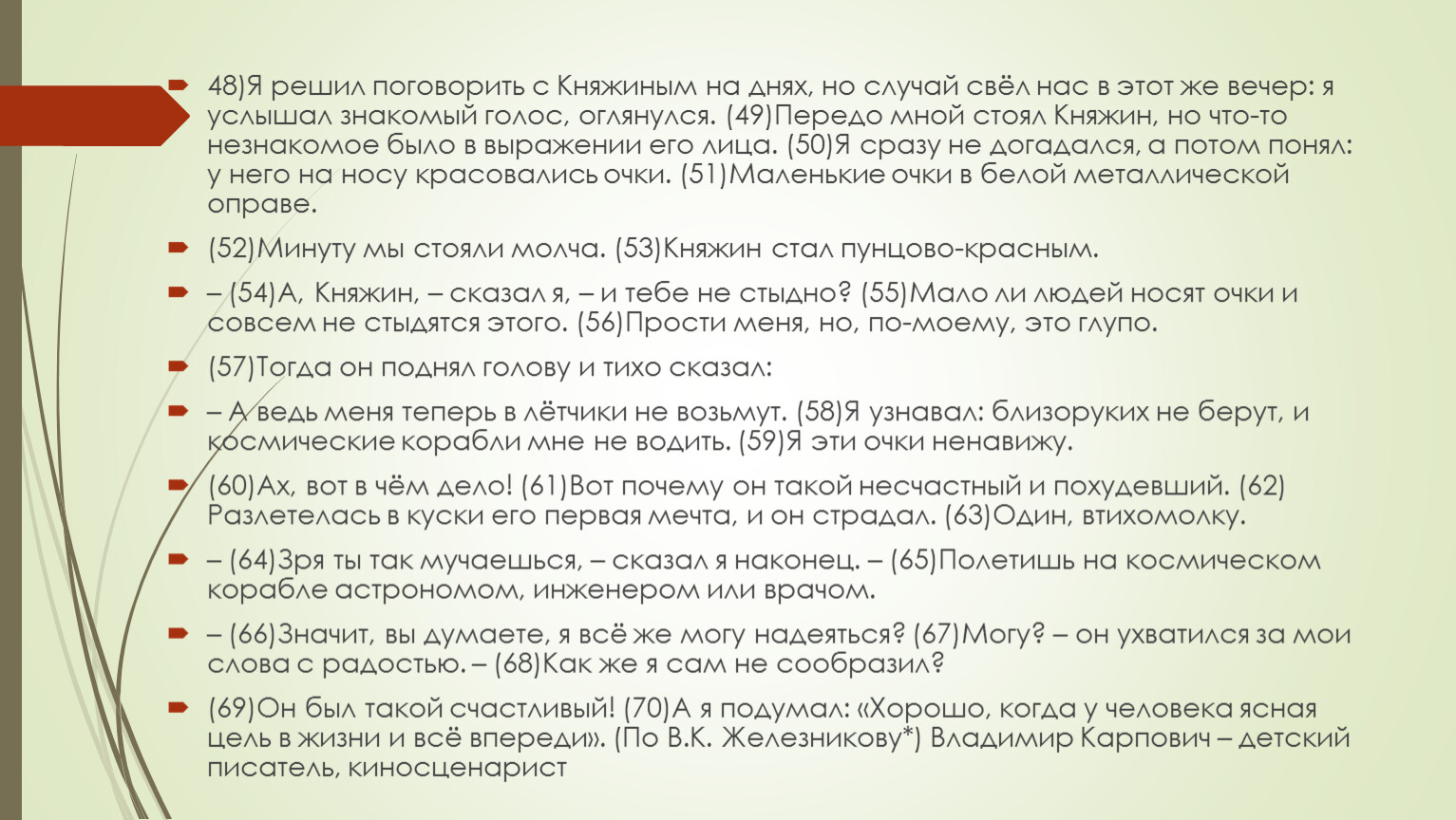 – (54)А, Княжин, – сказал я, – и тебе не стыдно? (55)Мало ли людей носят очки и совсем не стыдятся этого. (56)Прости меня, но, по-моему, это глупо.