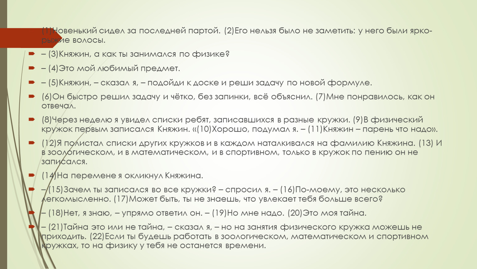 (8)Через неделю я увидел списки ребят, записавшихся в разные кружки. (9)В физический кружок первым записался Княжин. «(10)Хорошо, подумал я. – (11)Княжин – парень что надо».