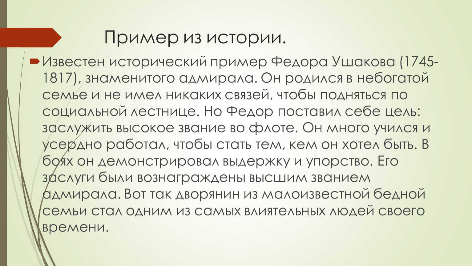 Известен исторический пример Федора Ушакова (1745-1817), знаменитого адмирала. Он родился в небогатой семье и не имел никаких связей, чтобы подняться по социальной лестнице. Но Федор поставил себе цель: заслужить высокое звание во флоте. Он много учился и усердно работал, чтобы стать тем, кем он хотел быть. В боях он демонстрировал выдержку и упорство. Его заслуги были вознаграждены высшим званием адмирала. Вот так дворянин из малоизвестной бедной семьи стал одним из самых влиятельных людей своего времени.