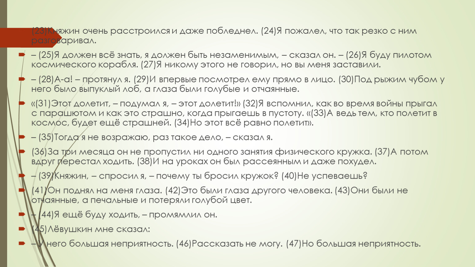 «(31)Этот долетит, – подумал я, – этот долетит!» (32)Я вспомнил, как во время войны прыгал с парашютом и как это страшно, когда прыгаешь в пустоту. «(33)А ведь тем, кто полетит в космос, будет ещё страшней. (34)Но этот всё равно полетит».
