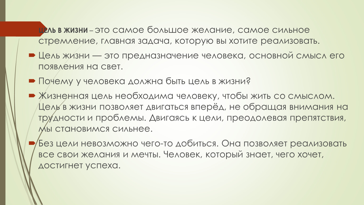 ЦЕЛЬ В ЖИЗНИ – это самое большое желание, самое сильное стремление, главная задача, которую вы хотите реализовать.