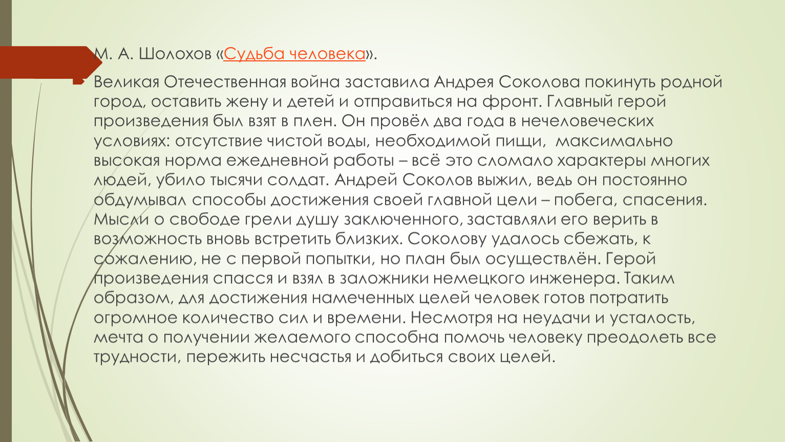 Великая Отечественная война заставила Андрея Соколова покинуть родной город, оставить жену и детей и отправиться на фронт. Главный герой произведения был взят в плен. Он провёл два года в нечеловеческих условиях: отсутствие чистой воды, необходимой пищи, максимально высокая норма ежедневной работы – всё это сломало характеры многих людей, убило тысячи солдат. Андрей Соколов выжил, ведь он постоянно обдумывал способы достижения своей главной цели – побега, спасения. Мысли о свободе грели душу заключенного, заставляли его верить в возможность вновь встретить близких. Соколову удалось сбежать, к сожалению, не с первой попытки, но план был осуществлён. Герой произведения спасся и взял в заложники немецкого инженера. Таким образом, для достижения намеченных целей человек готов потратить огромное количество сил и времени. Несмотря на неудачи и усталость, мечта о получении желаемого способна помочь человеку преодолеть все трудности, пережить несчастья и добиться своих целей.