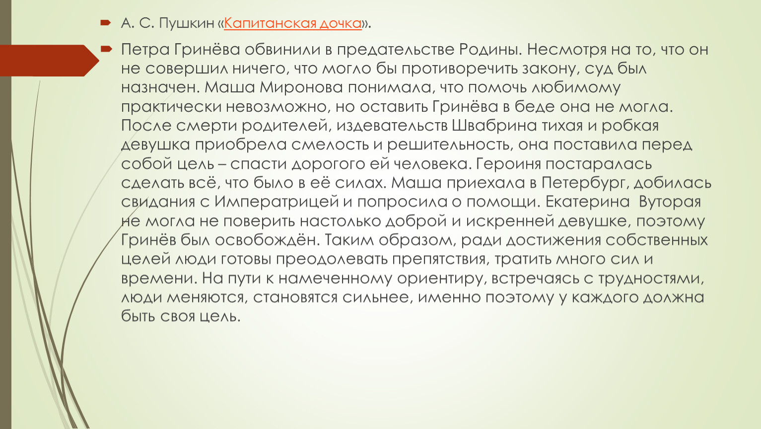 Петра Гринёва обвинили в предательстве Родины. Несмотря на то, что он не совершил ничего, что могло бы противоречить закону, суд был назначен. Маша Миронова понимала, что помочь любимому практически невозможно, но оставить Гринёва в беде она не могла. После смерти родителей, издевательств Швабрина тихая и робкая девушка приобрела смелость и решительность, она поставила перед собой цель – спасти дорогого ей человека. Героиня постаралась сделать всё, что было в её силах. Маша приехала в Петербург, добилась свидания с Императрицей и попросила о помощи. Екатерина Вуторая не могла не поверить настолько доброй и искренней девушке, поэтому Гринёв был освобождён. Таким образом, ради достижения собственных целей люди готовы преодолевать препятствия, тратить много сил и времени. На пути к намеченному ориентиру, встречаясь с трудностями, люди меняются, становятся сильнее, именно поэтому у каждого должна быть своя цель.